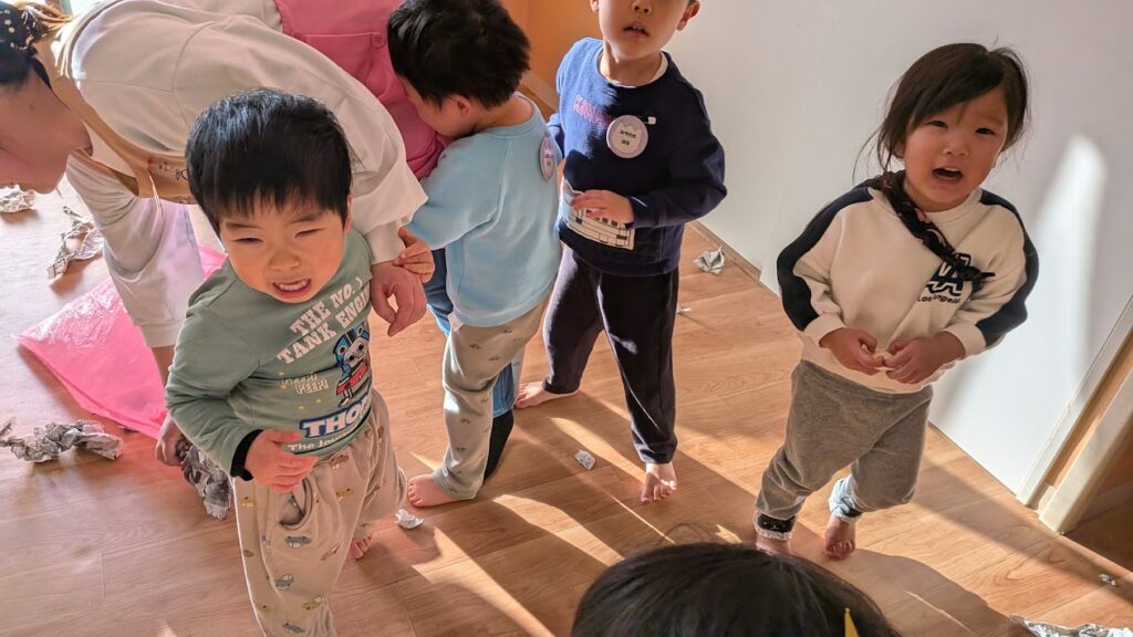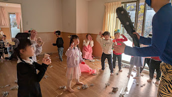 乳児さんは、外にいた鬼に新聞紙で作った豆を投げました!