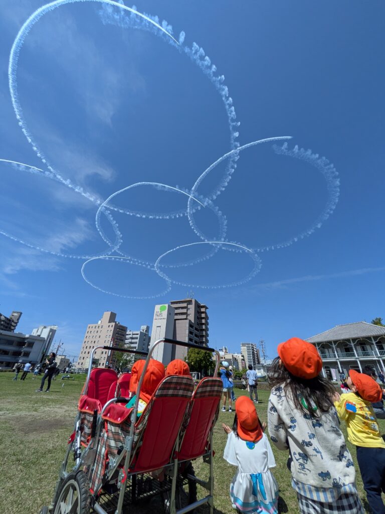 散歩をしていると、空にブルーインパルスが綺麗な桜を描いていました。