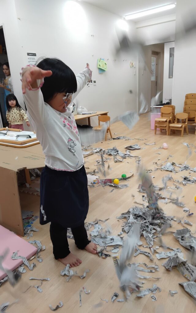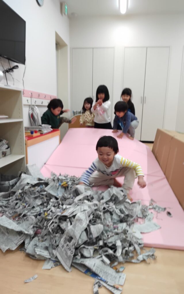 お外に行けない日は、新聞あそびを楽しんでいます✨