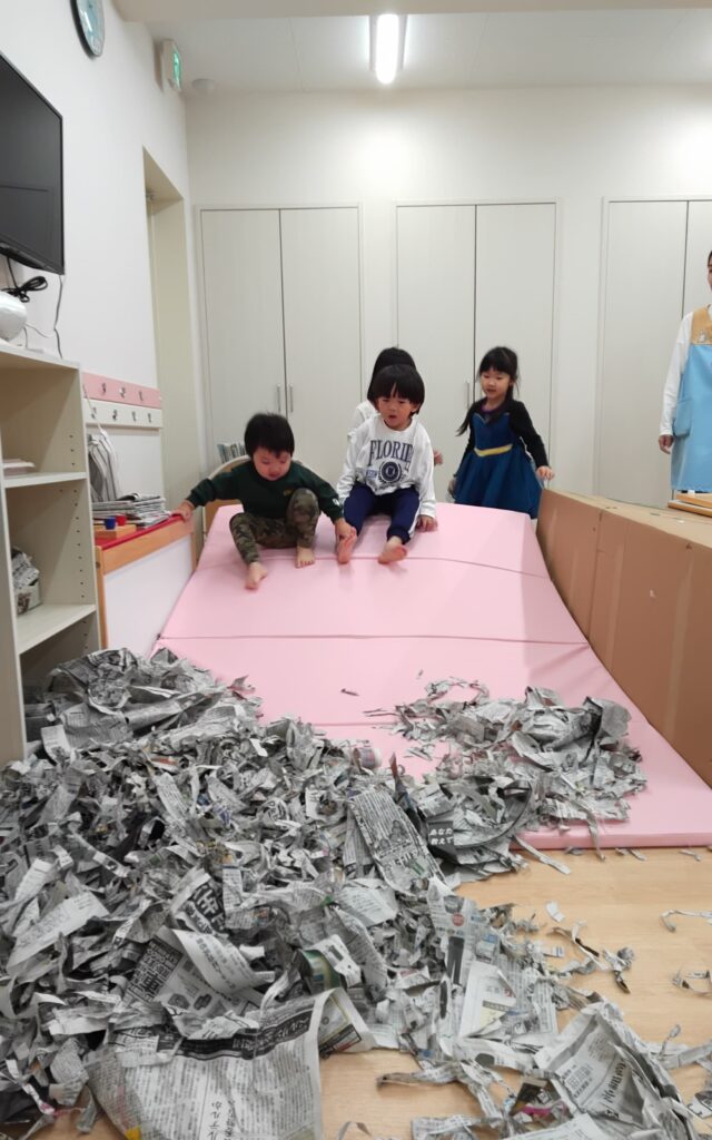 マットをすべり台に見立てて、すべった先の新聞に飛び込んで遊びました✨