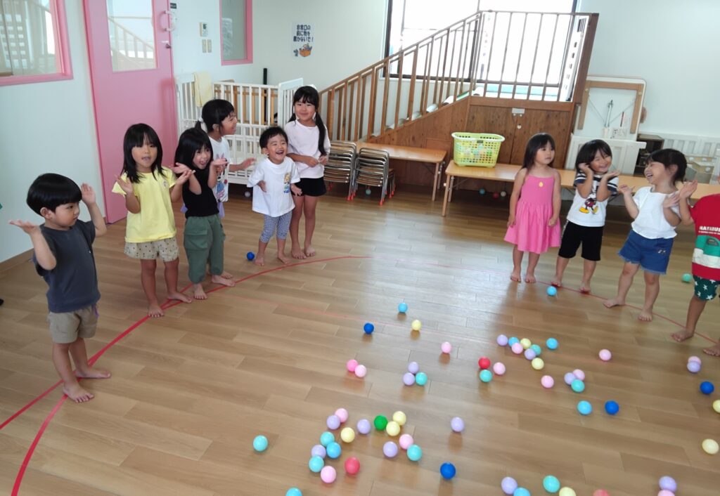 音楽に合わせて、とにかくボールを投げ続ける子、お部屋のボールを両手いっぱいに抱え込んで投げる子、それぞれ考えながら練習に参加していました‼️