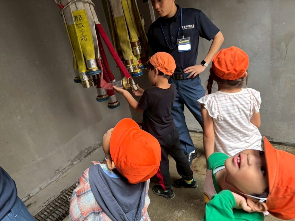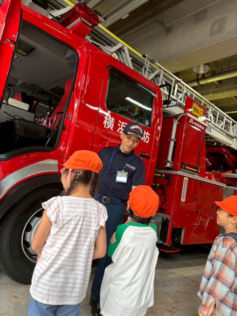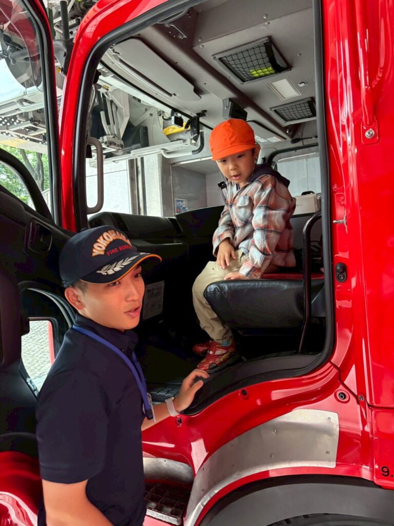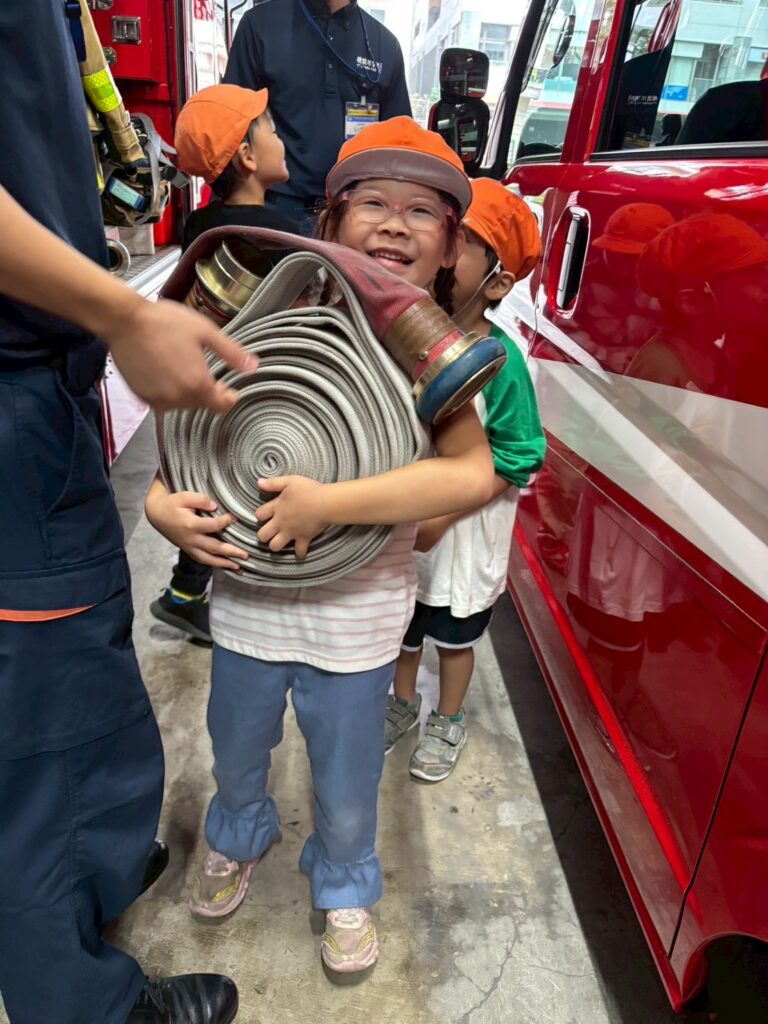 消防署の服やヘルメットを被って消防署の方と写真も撮りました!将来は消防士になる!なんてお話ししていた子も…☺️