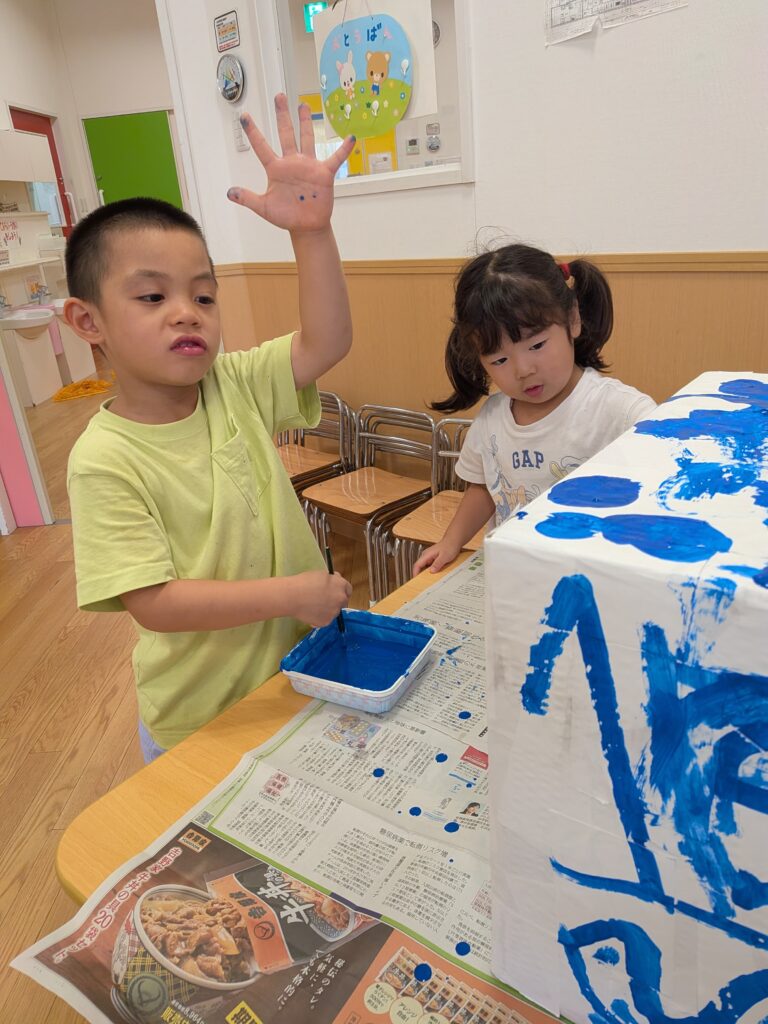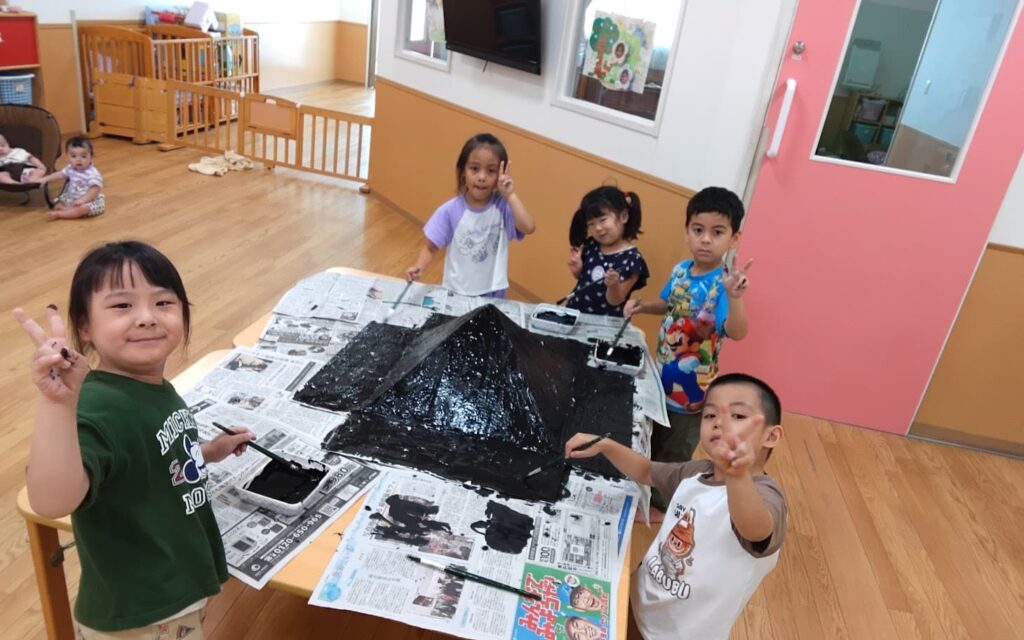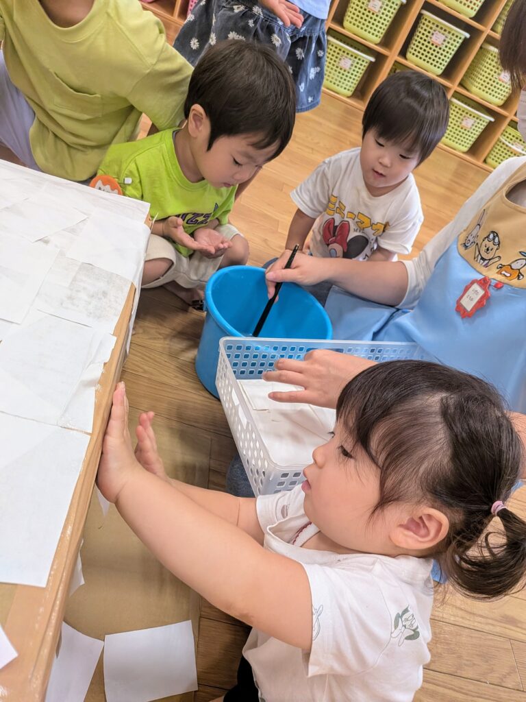 次は紙貼り、のりを付けてみんなで一生懸命紙を貼ります!3歳以上だけでなく2歳児も参加しました⭐