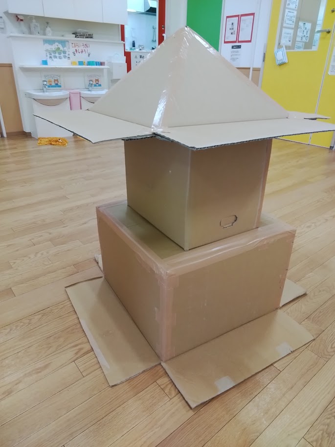 色付けは3歳以上で頑張りました⭐ 屋根は黒、土台は青と赤☺