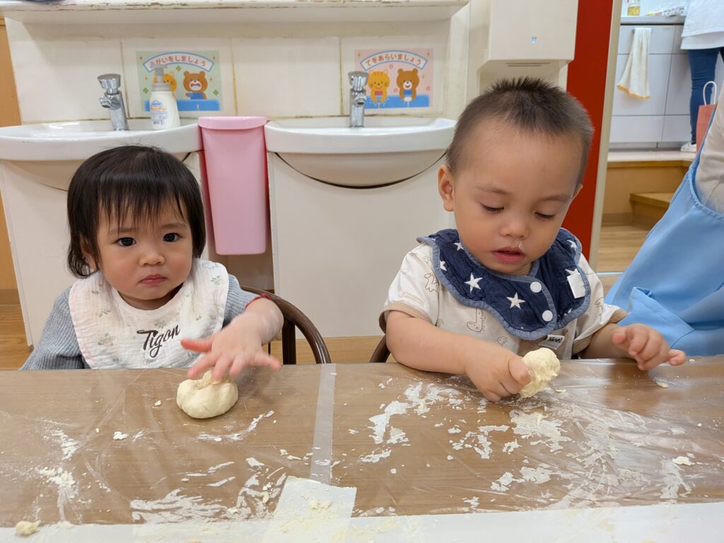 0.1歳児さんは小麦粉にお水を加えて(小麦粉粘土)なんちゃってお団子作り✨