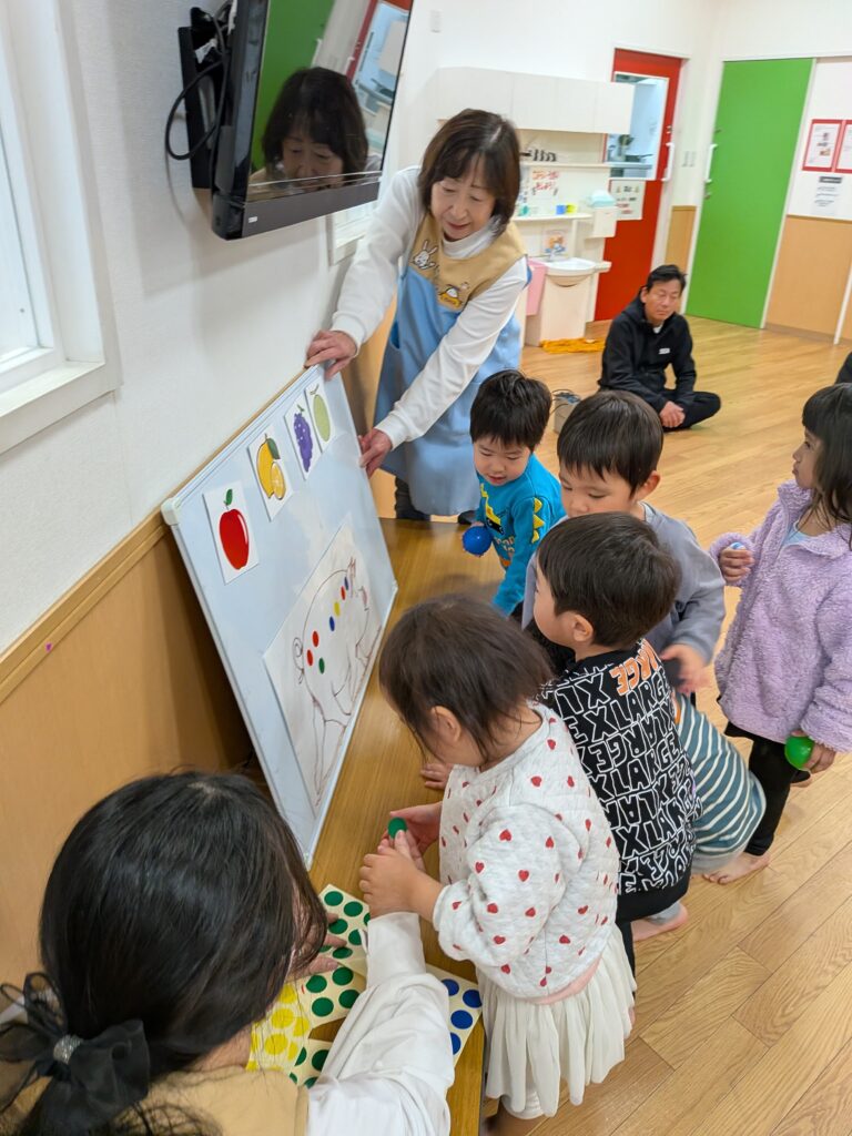食べさせてあげたり、ボールを色別に分けてカゴに入れたり。