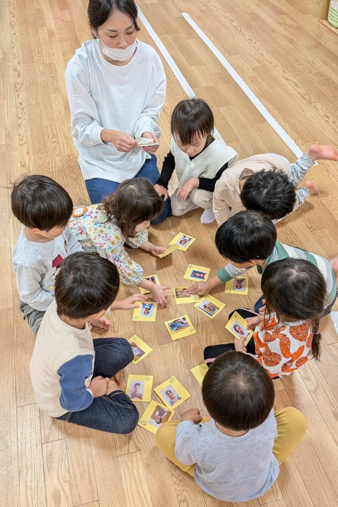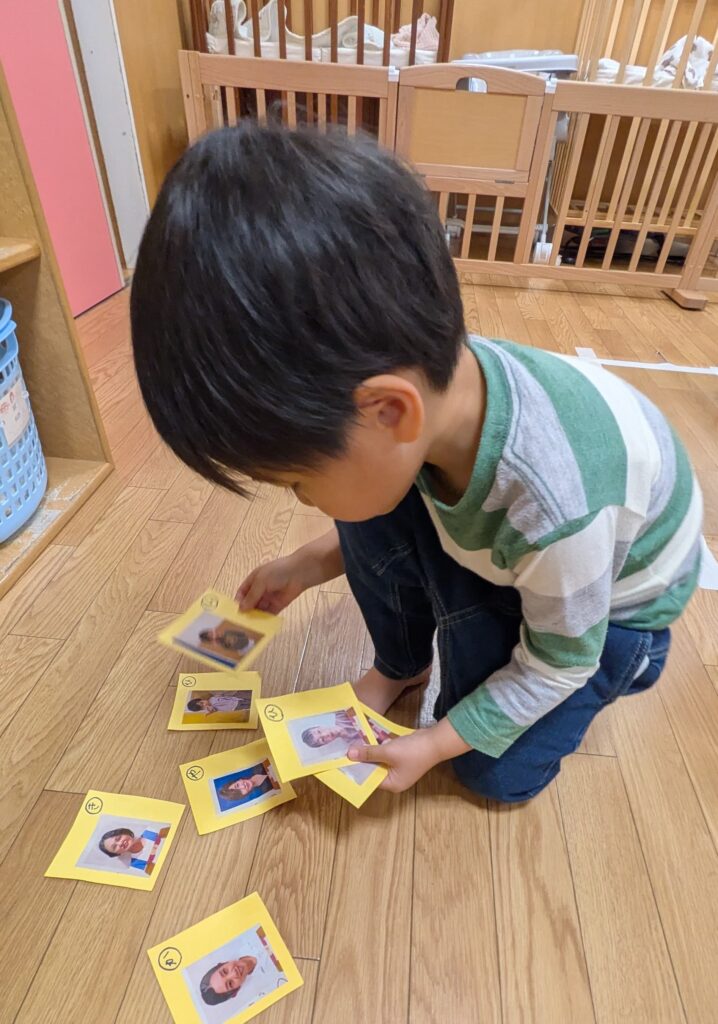 子どもたちやスタッフの写真が貼られたカルタが並べられていくのを不思議そうに眺めています👀✨️