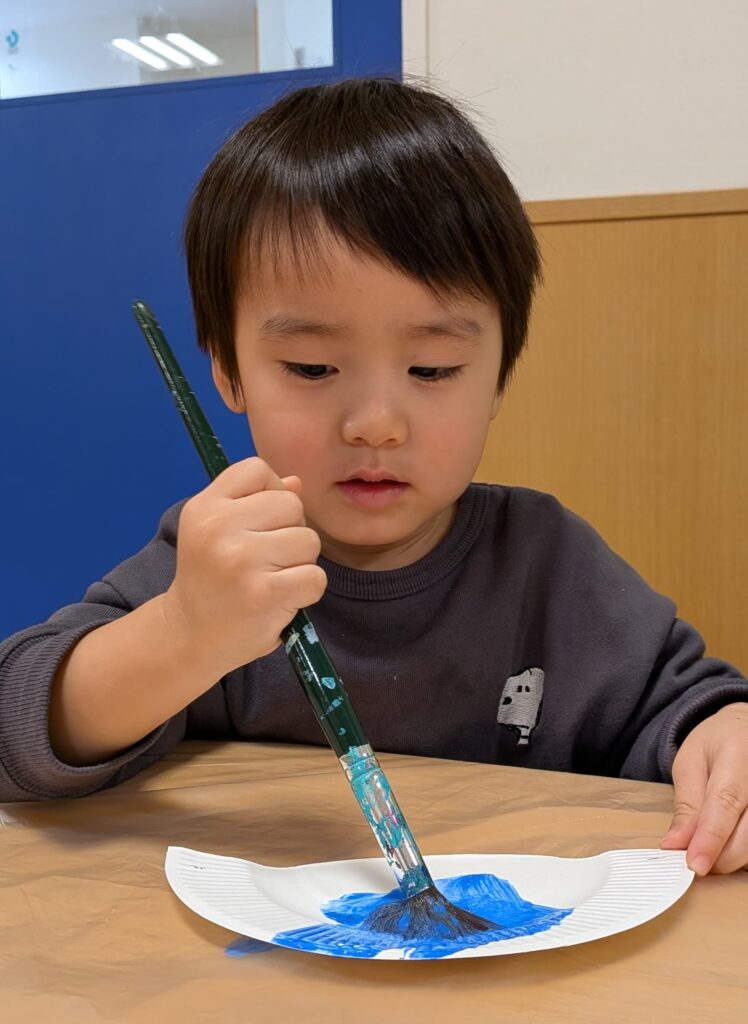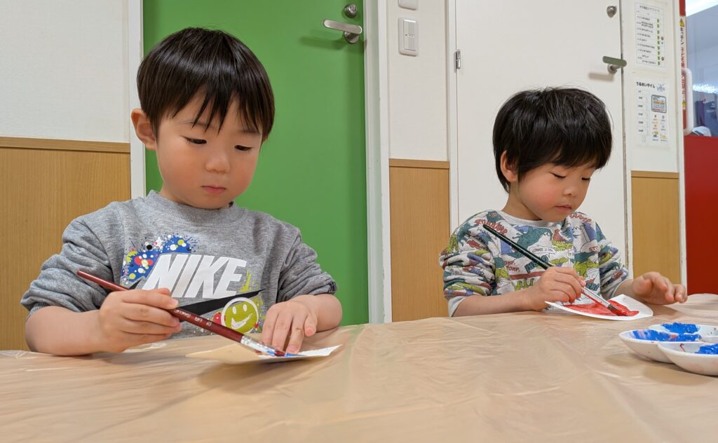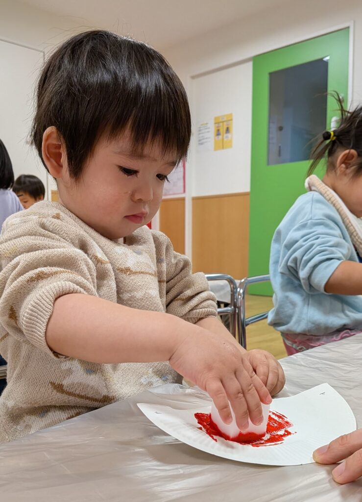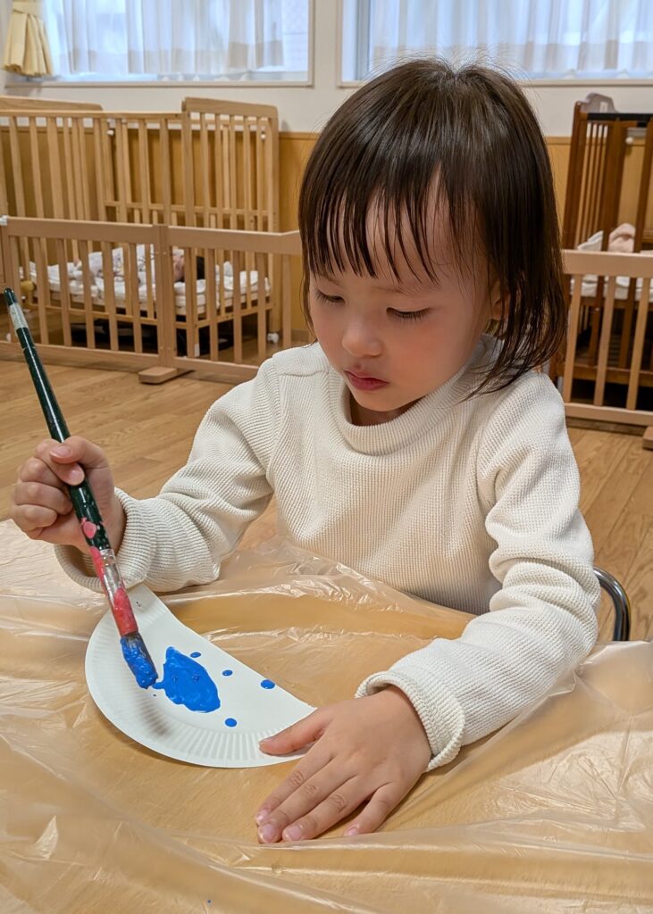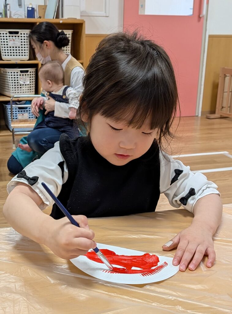 鬼のお面製作では、絵の具でペタペタ飾り付け🖌️