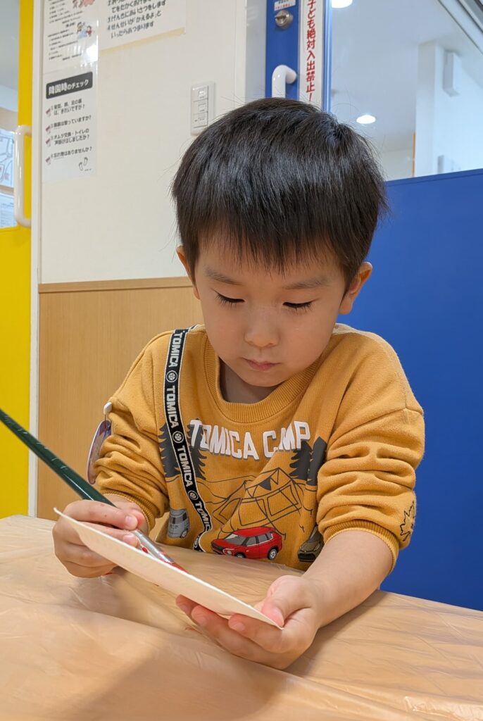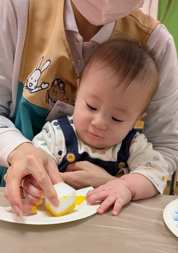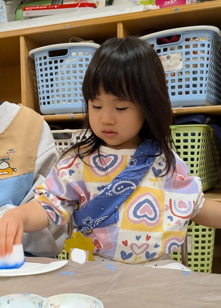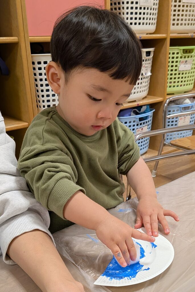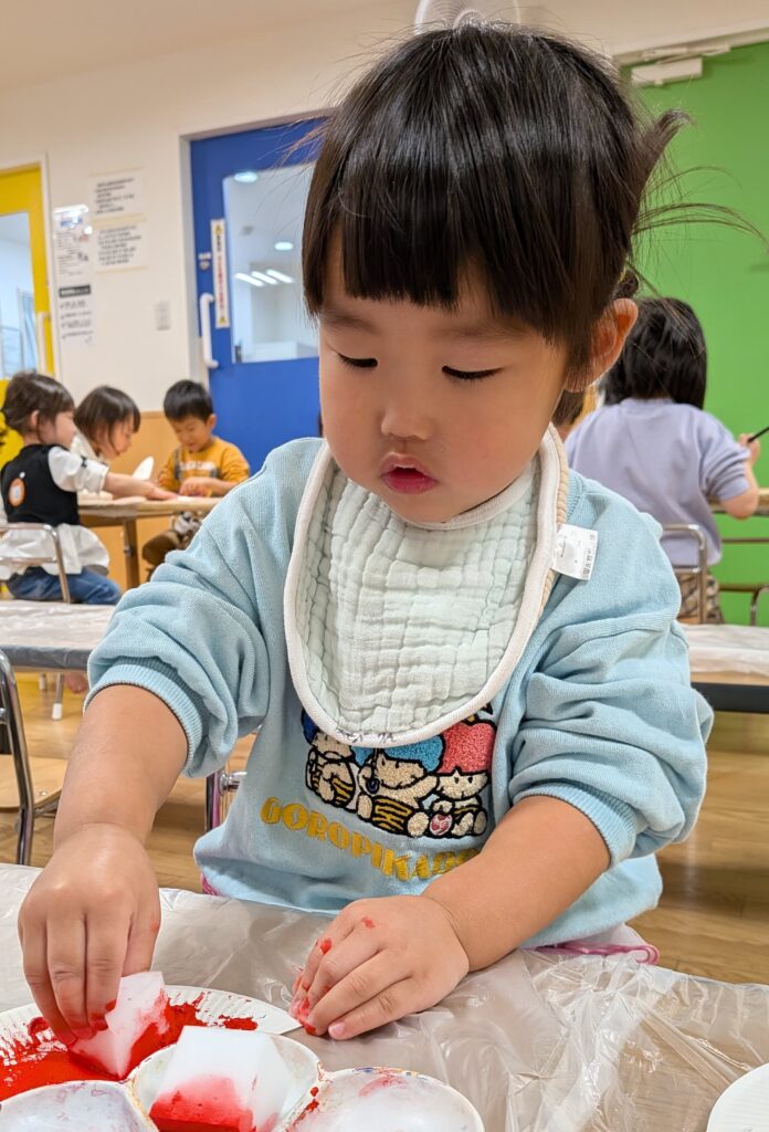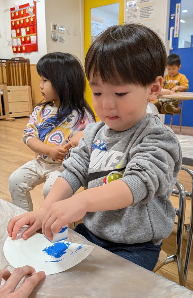 鬼のお面製作では、絵の具でペタペタ飾り付け🖌️