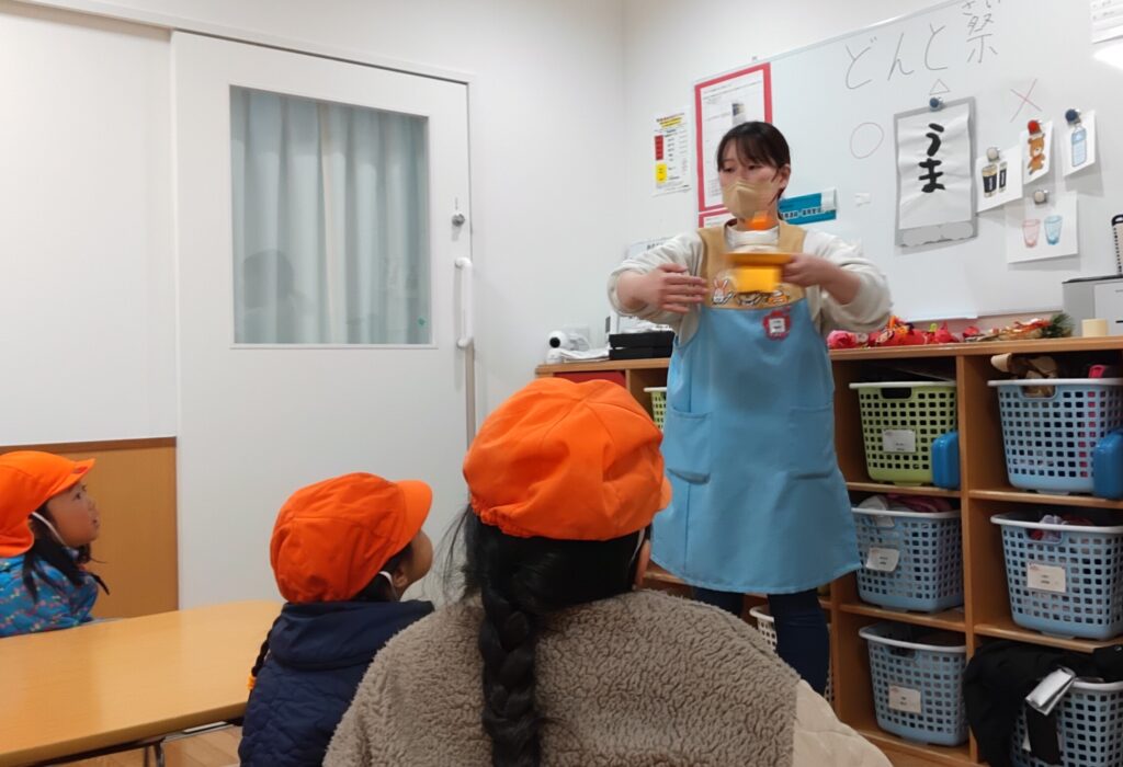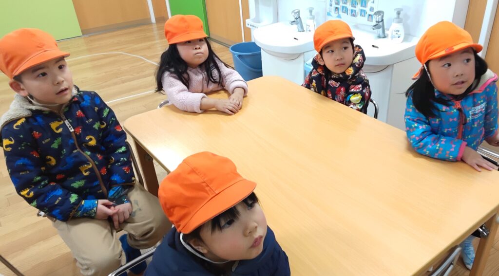 出発する前にどんと祭の導入しました!御神火で燃やしていいものをクイズ形式でお勉強しました。  「水は燃えないよ」「ぬいぐるみはかわいそうだよ」などそれぞれの意見を発表する子どもたち。