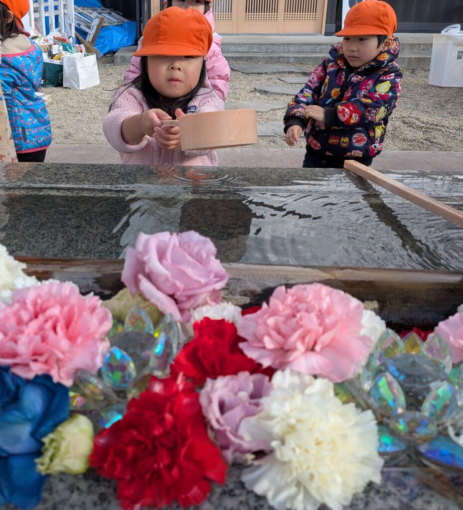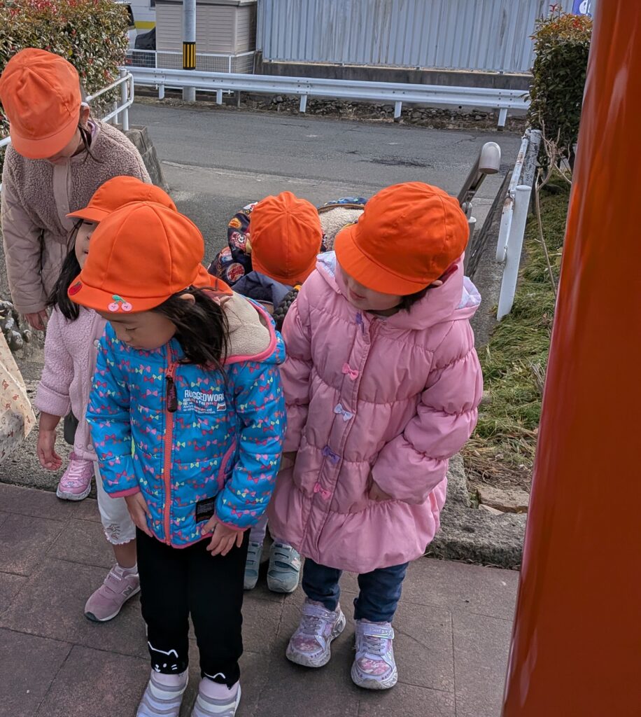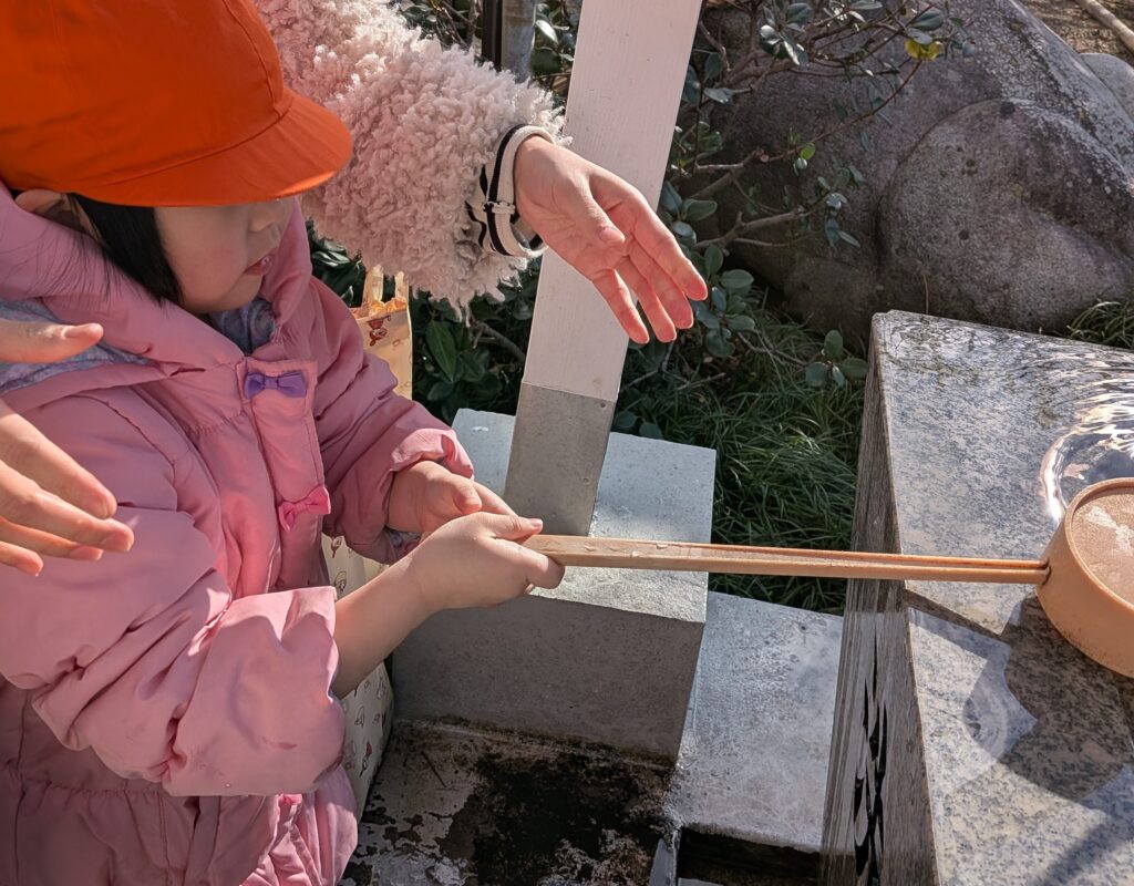 神社に着くとその場所でのルールもその都度確認しながら過ごしました。中央を避けて参道を歩いた先には手水舎。ここでもやり方を良く聞き実践する子どもたち。                     「どうしてやらないといけないの?」「何で順番があるのか」と疑問が沢山の子どもたちでした。