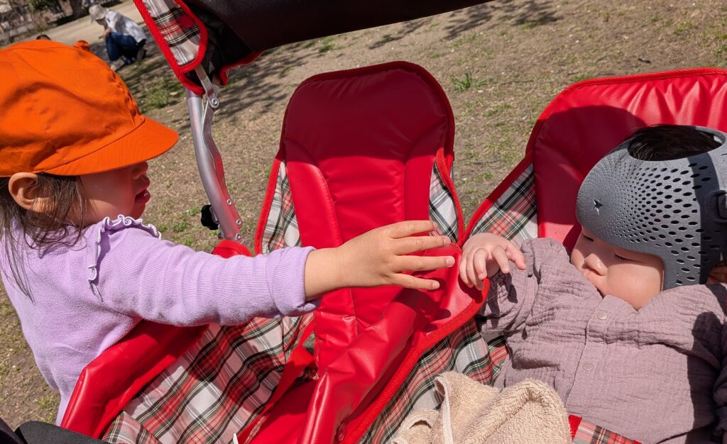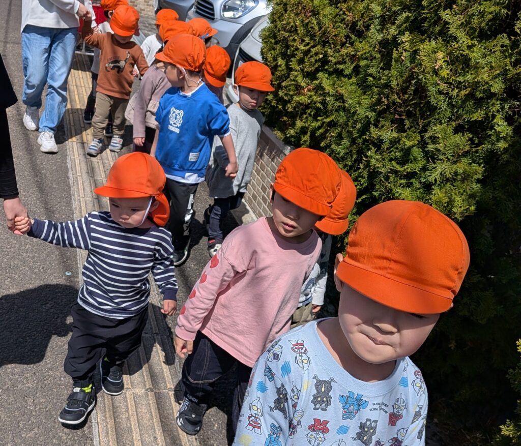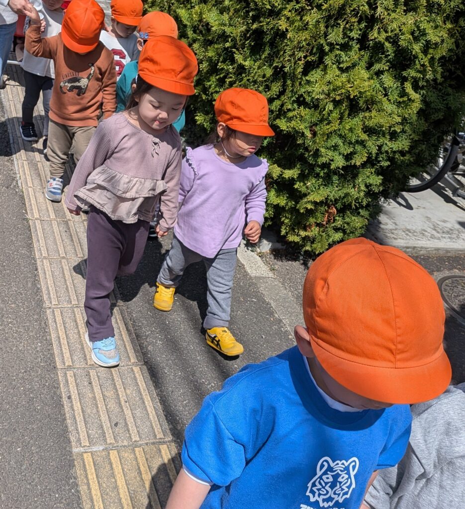 まずは、手を繋いでいっちに、いっちに!歩くところから。新入園児さんたちも転ばずに歩くのがとっても上手なんですよ🤩園では涙を流しているおともだちもお外にでたら涙がピタッと止まりました◎
