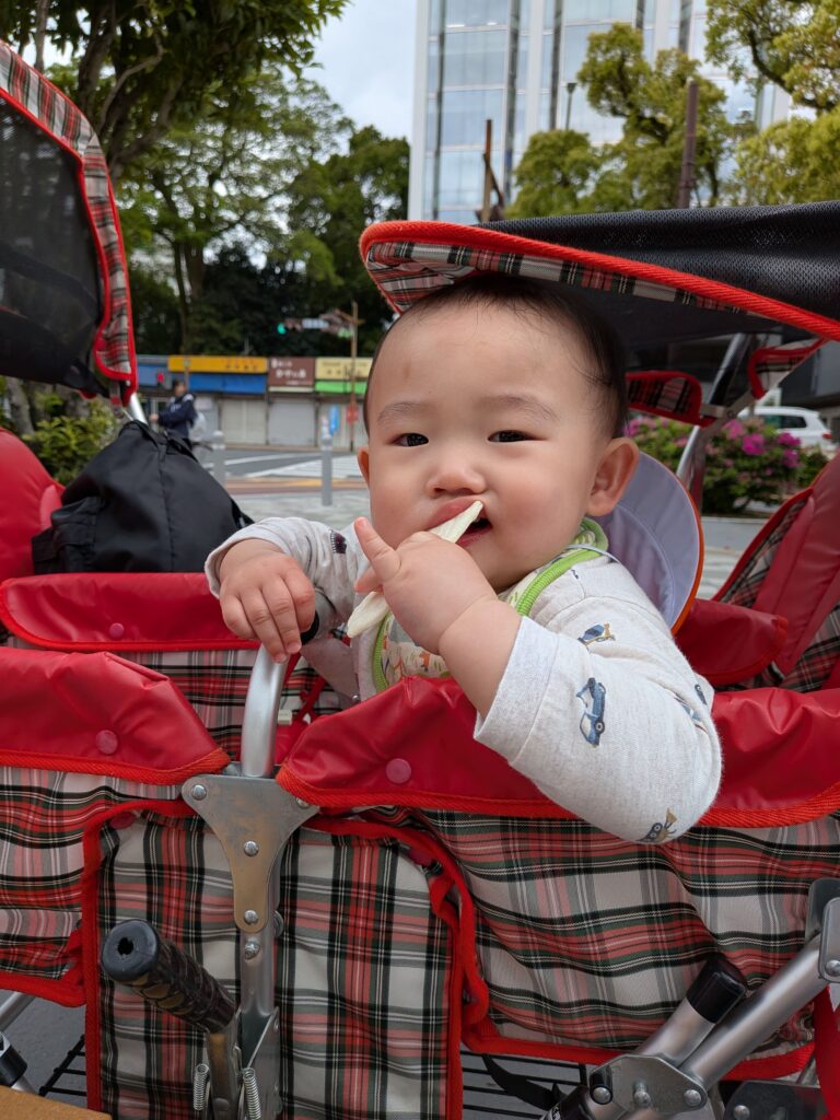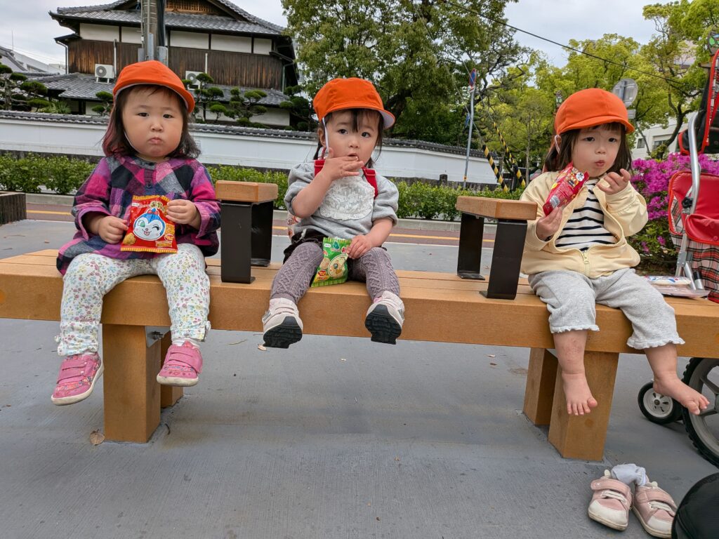 公園に到着するとまずはおやつタイム♪外で食べるおやつは格別です!1歳児さんの女の子はアンパンマンのお菓子を偶然もちより、「アンパンマン!」と興奮していました💓
