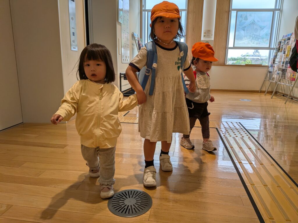 おやつタイムが終わると公園へ!!一緒にブランコに乗ったり、滑り台を滑るよちよちのお友だちをあたたかく見守ってくれたり、異年齢児同士の関わりも見られました😆楽しく遊んでいるとまさかの雨が降り始め・・・急遽、オーテピアの科学館に行先を変更!1歳児さんは初めてのオーテピア。遊び方の説明をしてくれたり、こちらでも4・5歳児さんがお世話をたくさんしてくれましたよ💛