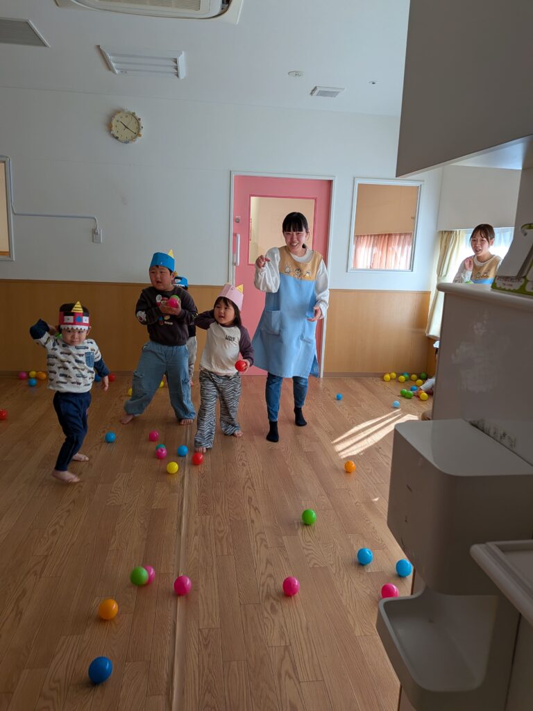 節分がどんな日か教えてもらい、豆まきの練習を!(今年はボールをまめ代わりにしました!)