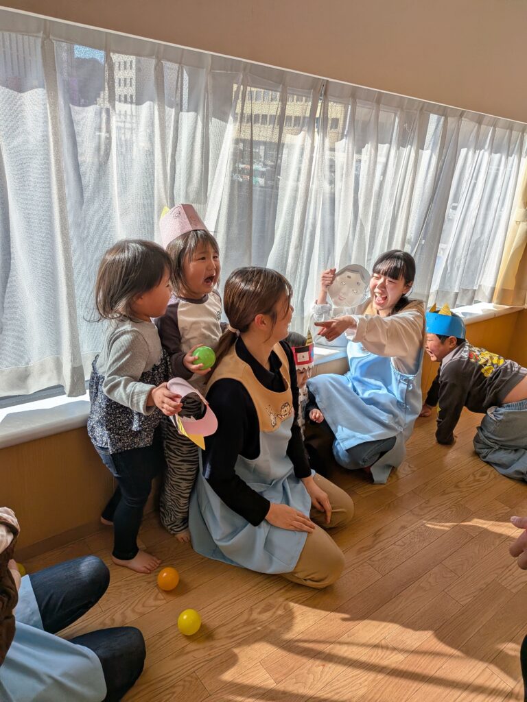 2月3日は節分の日!子どもたちは、鬼のお面の製作をしながら「鬼さん来る?」や「鬼をやっつける!💪🏻」などたくさん教えてくれました!