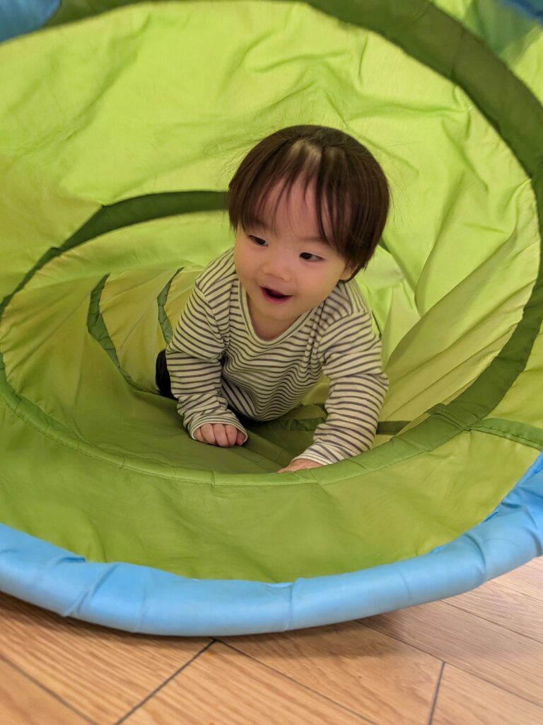 机を滑り台に見立ててみたり、トンネルやボール、でこぼこ道など!!最初は、『なになに!!』と様子を窺う乳児さんたちでしたが、保育士がお手本を見せてあげると、『おーーー!!やってみるぞ!』と保育士の後ろについて遊んでいましたよ😊💫