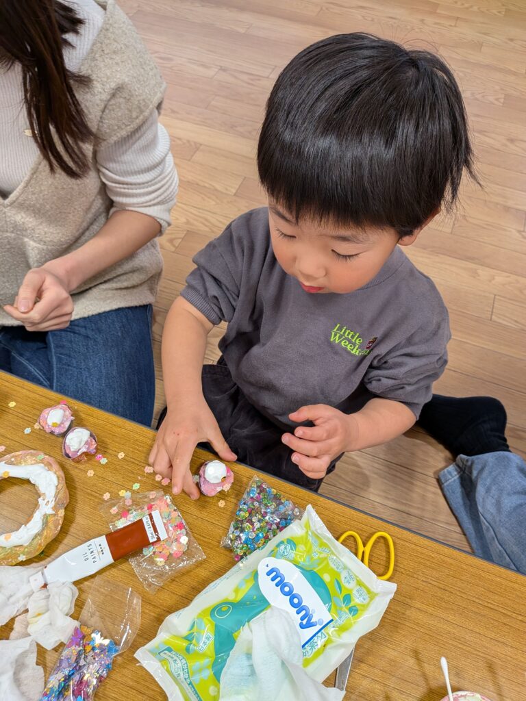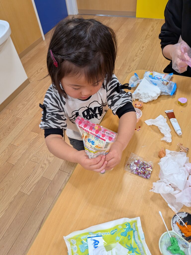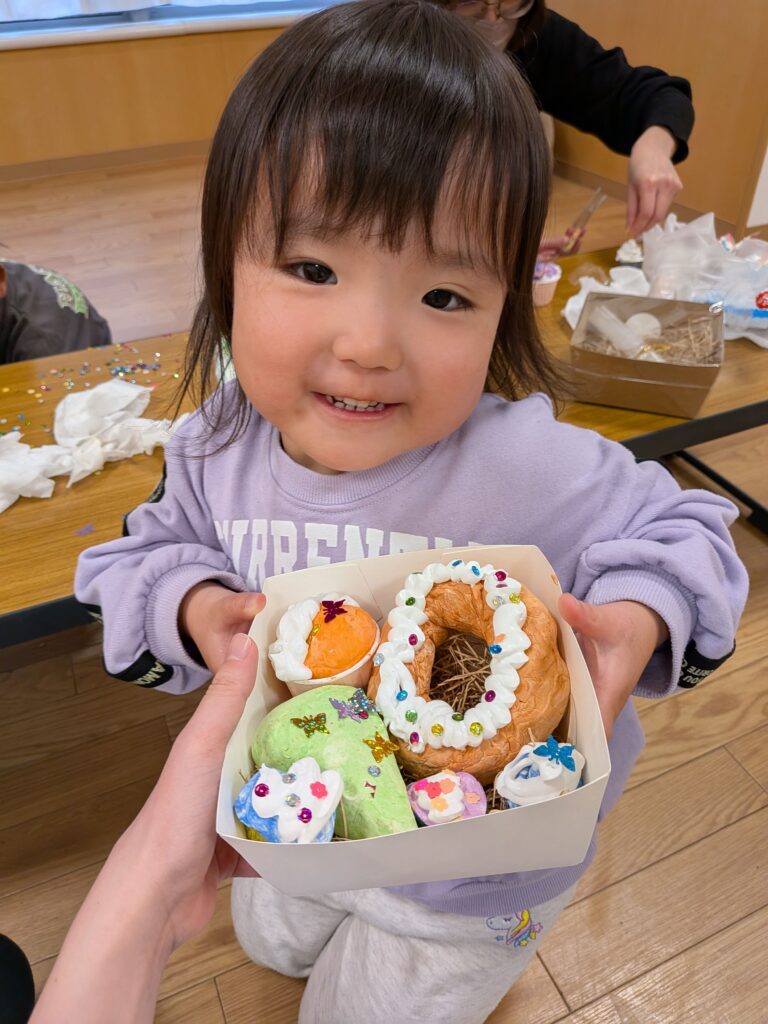 紙粘土でケーキやドーナツなどスイーツを作りました!!保護者の方に絵具で色を付けてもらい、色がついた紙粘土を子どもたちが好きな形にコネコネ!!出来上がった物の上にパラパラ~!とスパンコールを付けて完成!!完成したものを、保護者の方と一緒に喜んだり、保育士に「できたよー!!」と見せてくれる子どもたちです😊💖