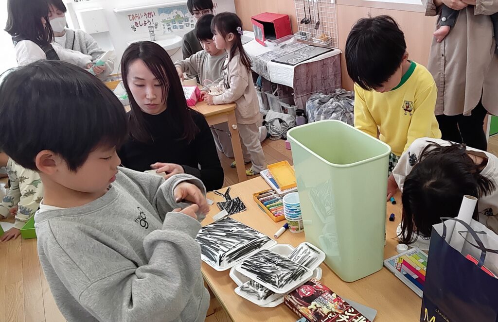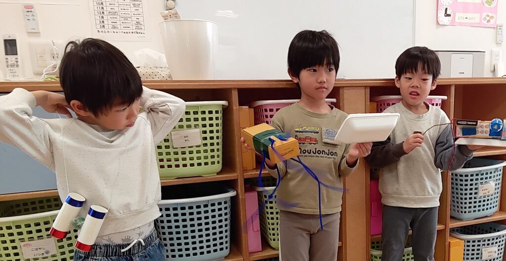 4、5歳児さんのクラスでは最近ハマっている廃材工作を保護者の方たちと一緒に製作しました。