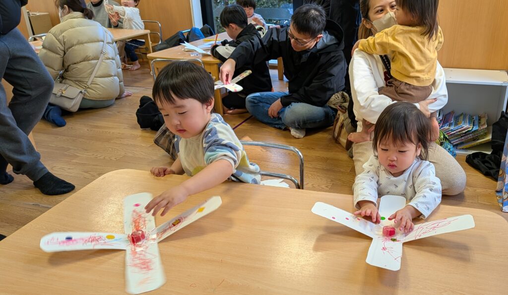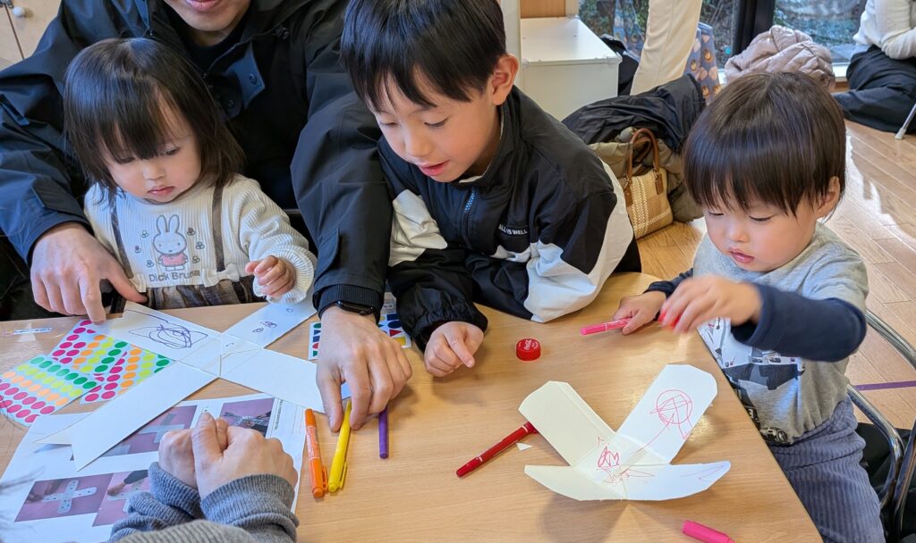保育園で作って持って帰ってくる工作は子ども達にとってどれほど熱中できる物なのかを一緒に体験しましたよ。