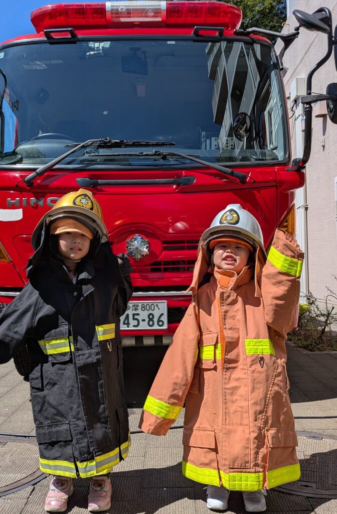 「僕も✋/私も✋」と次々に手が上がってみんなで消防服を着せてもらいました😝