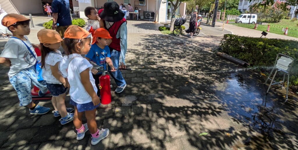 隣のスペースでは実際の消火器(※中身は水)を使って火の的目掛けて…消火だぁぁ!!!!