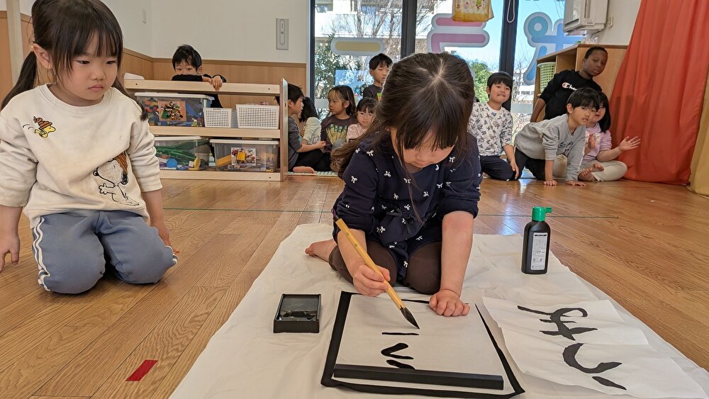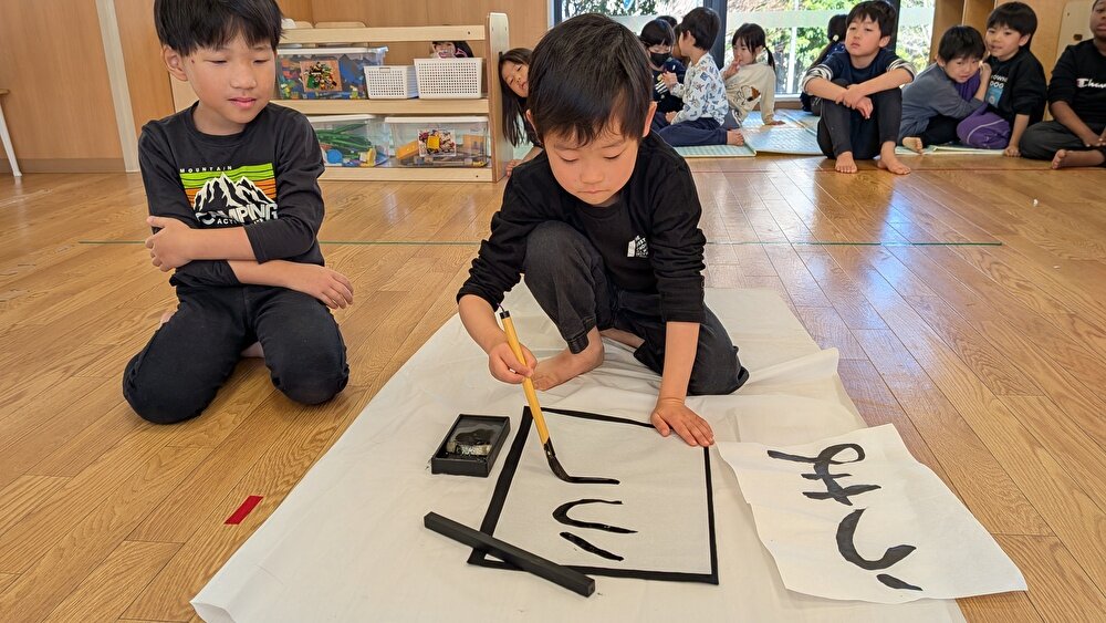 本格的に墨汁と毛筆で習字に挑戦するということで、前日から「明日は墨って言うの使うから全身黒っぽい服着てくるんだって~」とお互いに確かめ合っていて、張り切っている様子が見られました😊