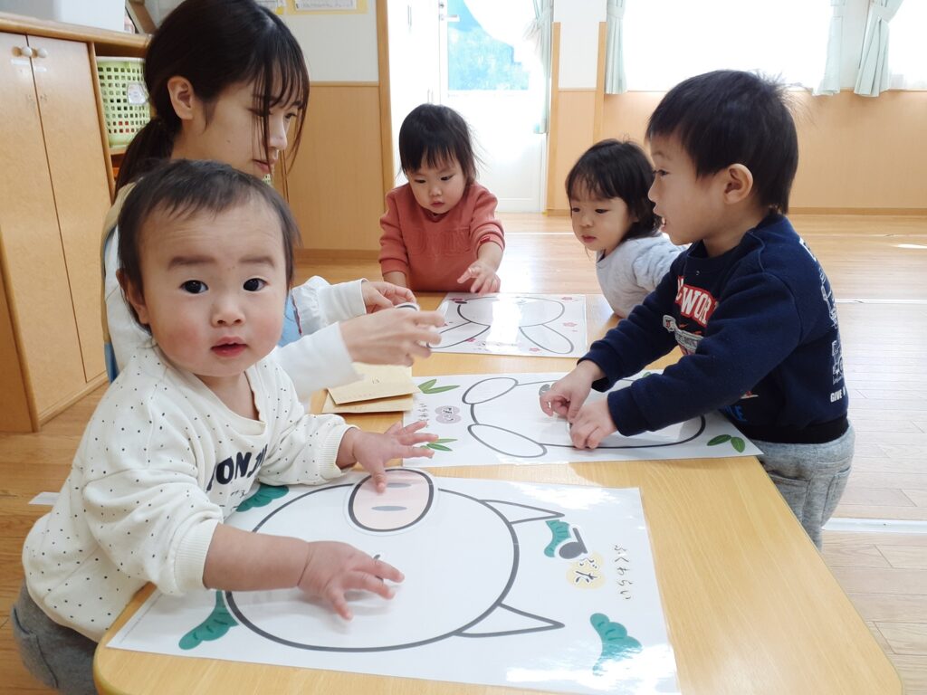 乳児さんは動物の福笑いと書き初めをしました!
