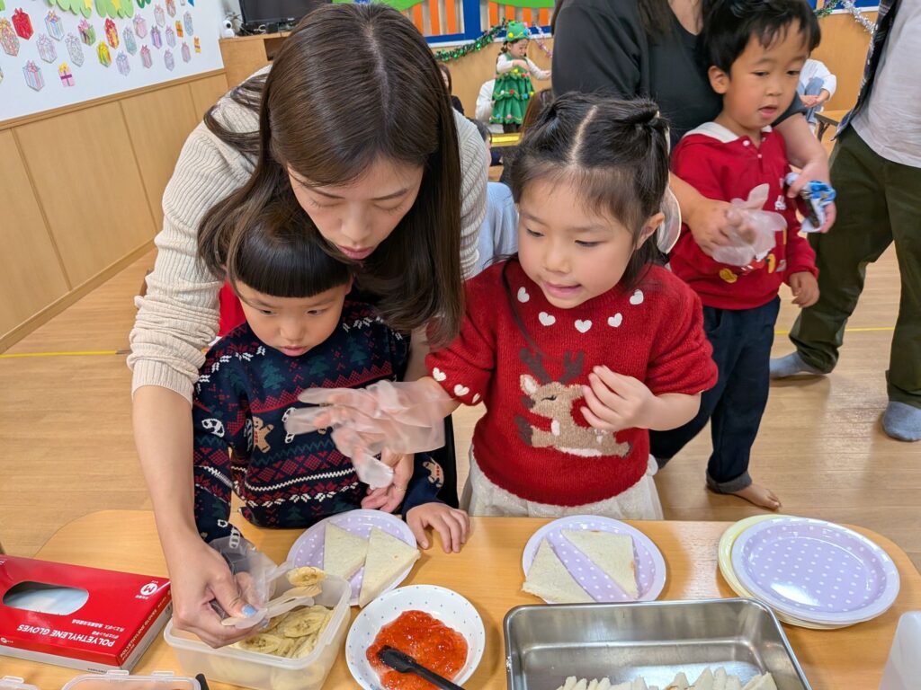 おやつの「サンドイッチ🥪」も保護者の方と楽しんで作っていました