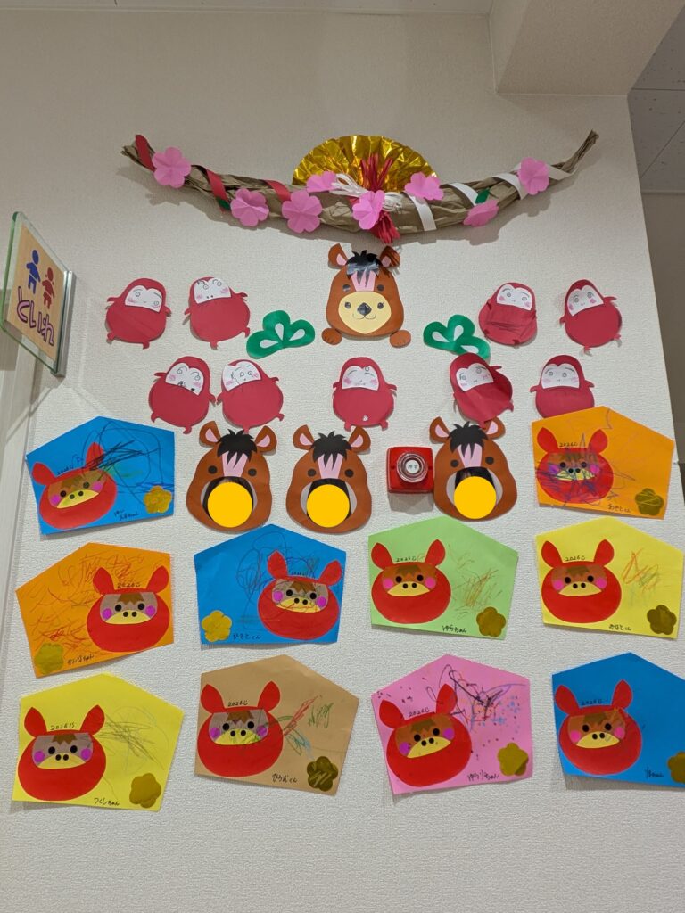ポポラッコ、午年生まれの先生たちが馬の被り物でお正月感のある玄関です🐎
