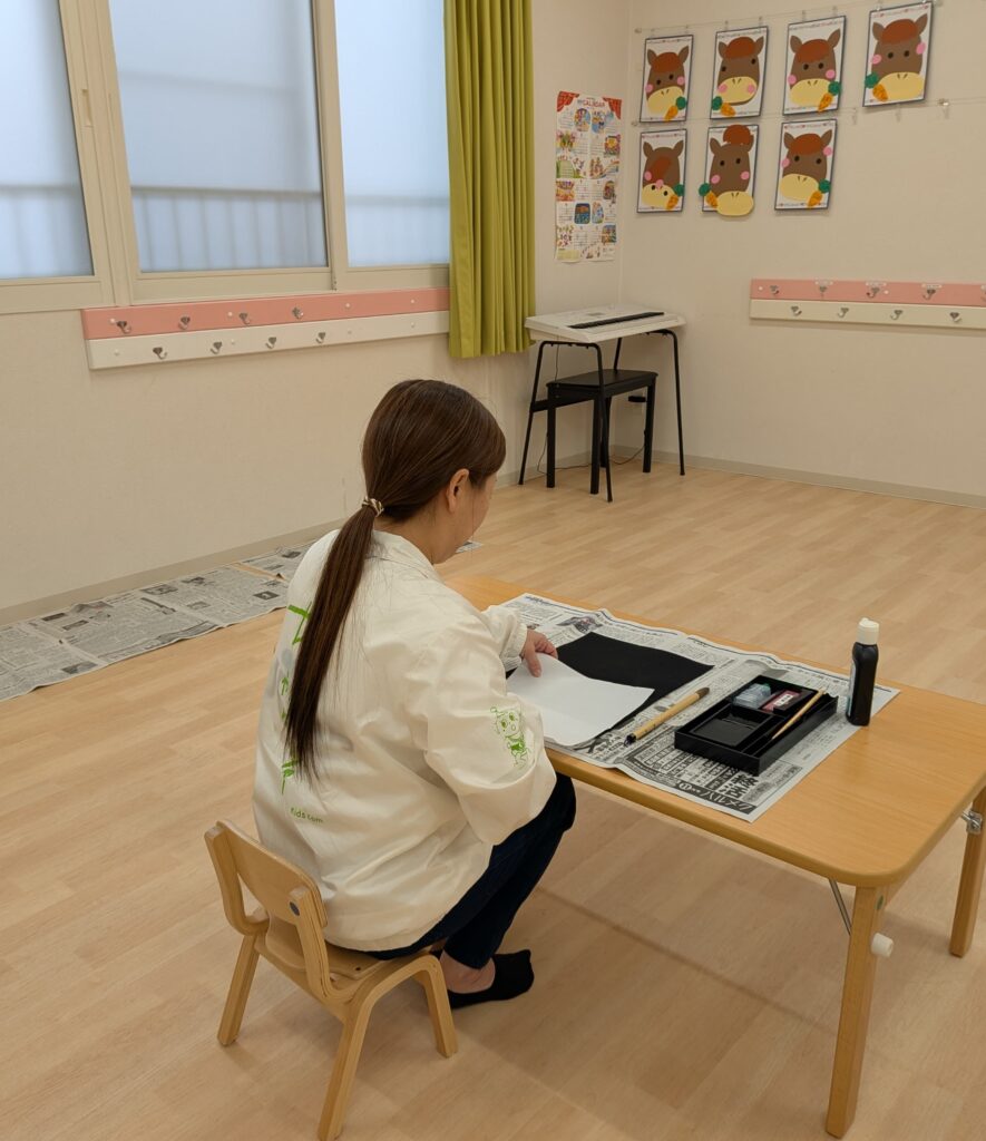みんなの前で「うま」く見本を書くためにひっそりと練習している園長先生を見つけました (笑)