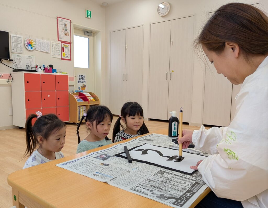 園長先生の見本を見ながら一画一画慎重に書いたり、勢いよく書き上げたりと