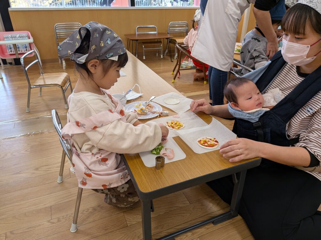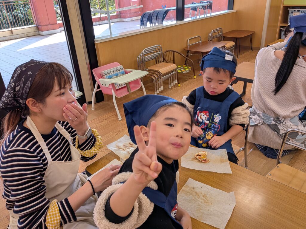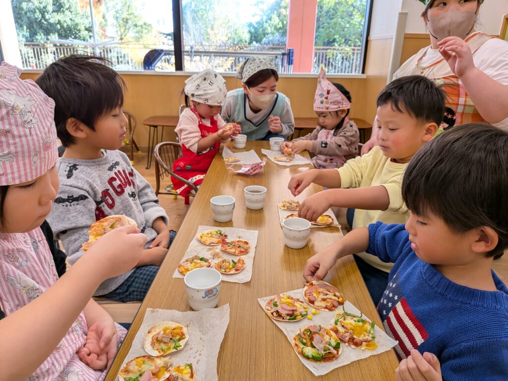 美味しそうなピザが完成すると、元気な声で「いただきまーす!」