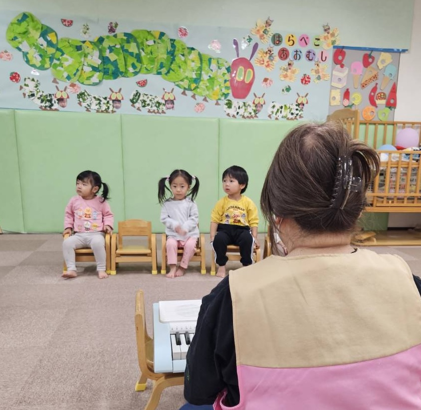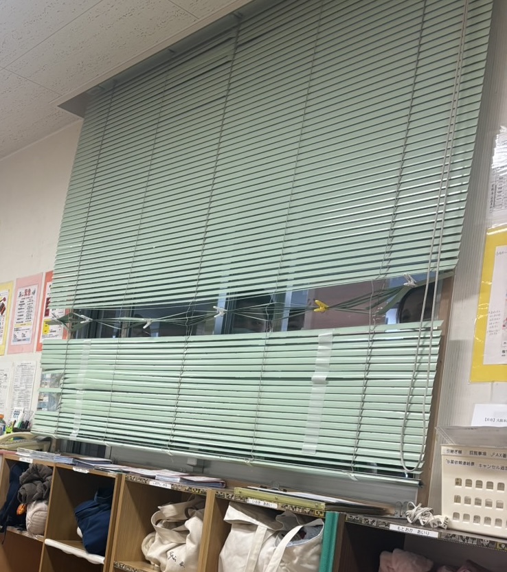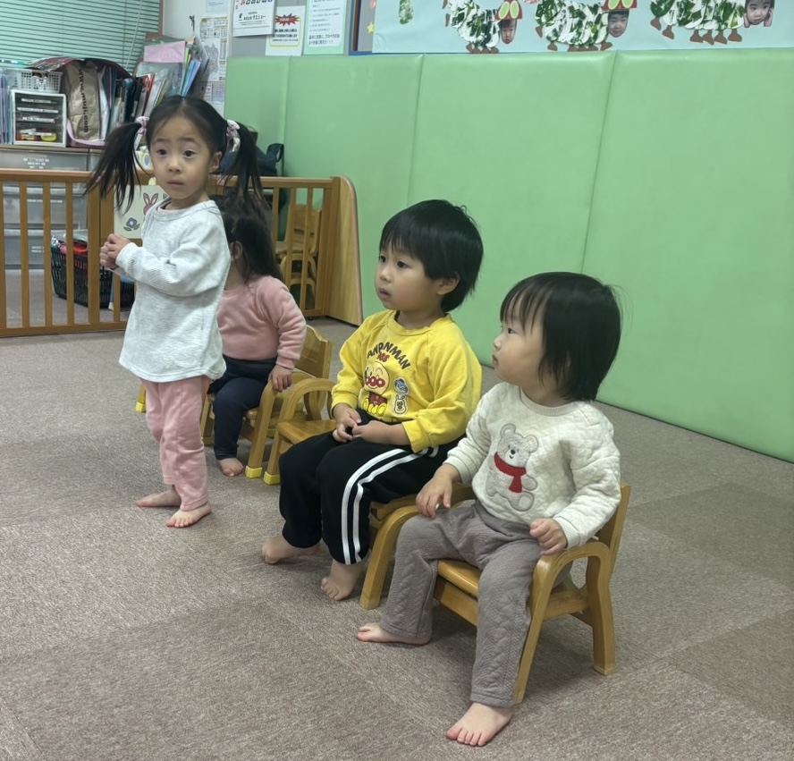 病院内の施設なので感染予防対策が重要であること、低年齢児さんが多いこと、また、初めての参観でお父さんお母さんのお顔を見たら泣いてしまうかも・・・、などの理由から、今回はお部屋の外からブラインドを少し開けて見ていただく形になりました。
