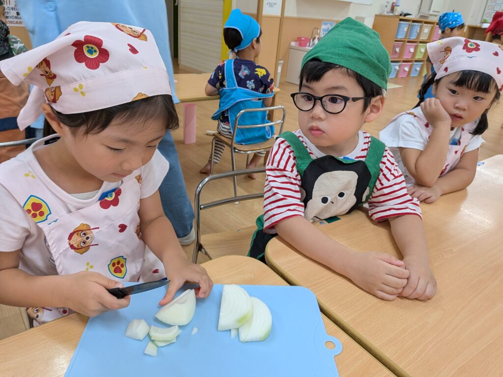 包丁にピーラーに子どもたちも慣れたもの…、「いつもやってるよ~」や「やったことないけど、できる!」とみんな積極的に作ってくれていました!
