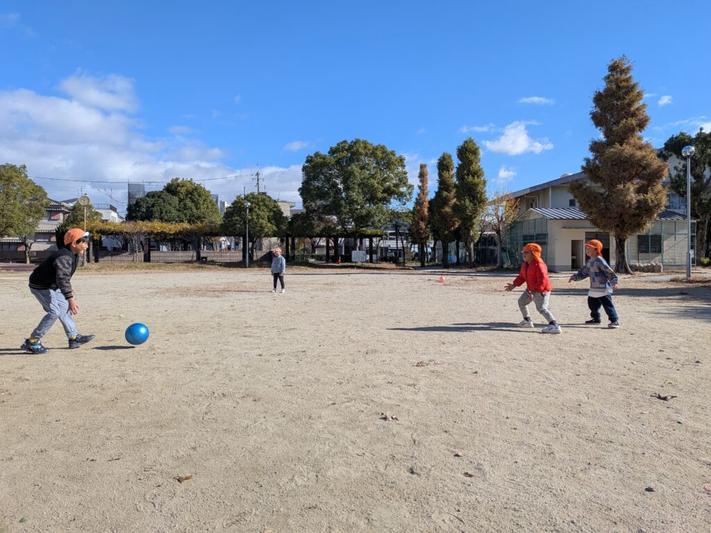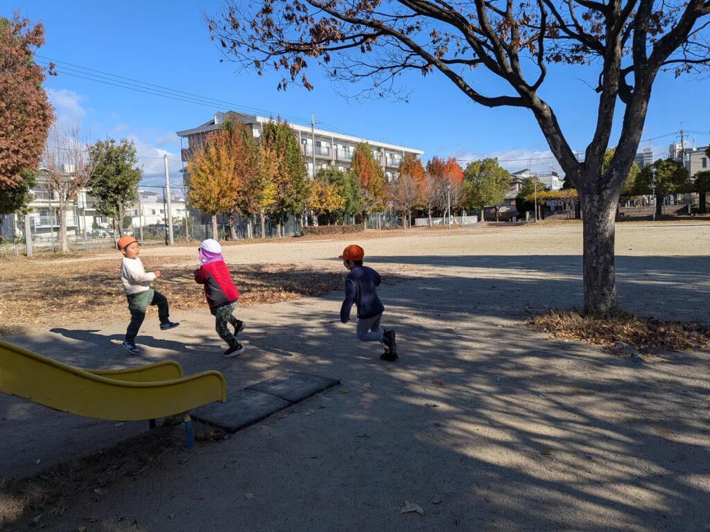遊び始めは緊張して自分たちの園のお友だち同士で遊んでいたのですが途中から「一緒に鬼ごっこしよー」と誘って遊んだり、4歳児のお友達が「お兄ちゃん一緒にサッカーしよー」と誘ってくれたり…少しずつ交流する姿も見られました✨更にうんていを一個飛ばしでやっているお友だちがいてそれを見て挑戦!「むずかしい」と最後まで行くのは難しかったようですが諦めずに頑張っていました😊