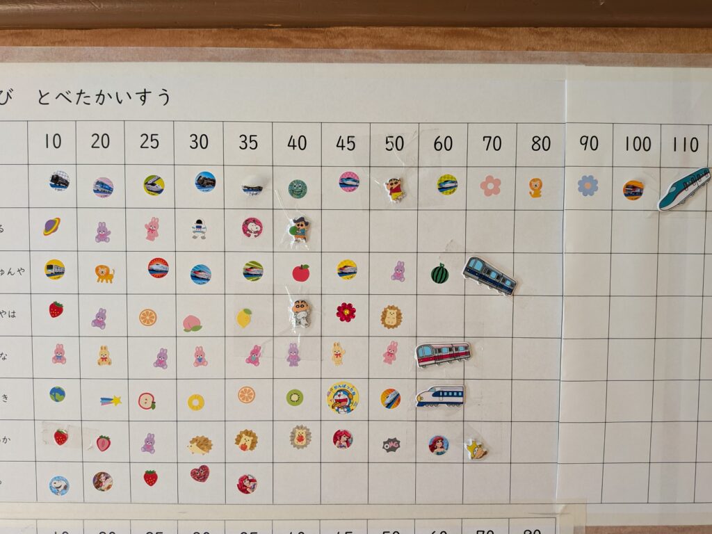 園の受付にはなわとび表を掲示しています。跳べた回数の分だけ好きなシールを貼るので子どもたちはシールが貼れる度に嬉しそうです。「○○くんここまでとんだんだ!すごい!✨」と表を見て会話が弾みます。