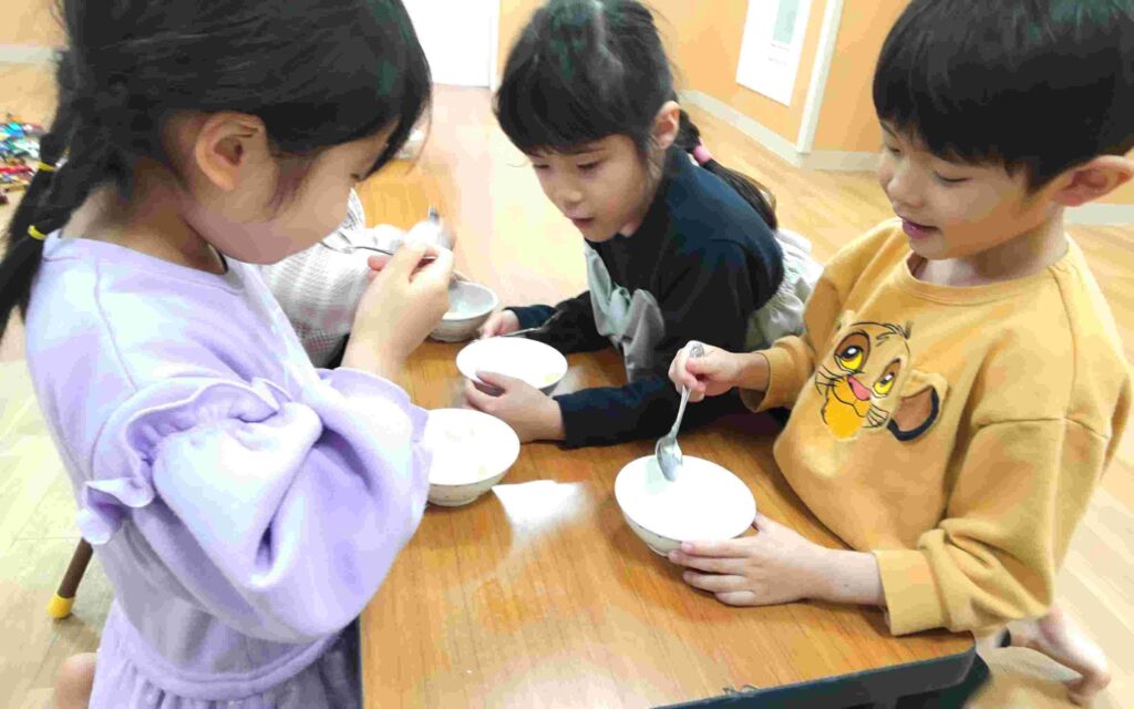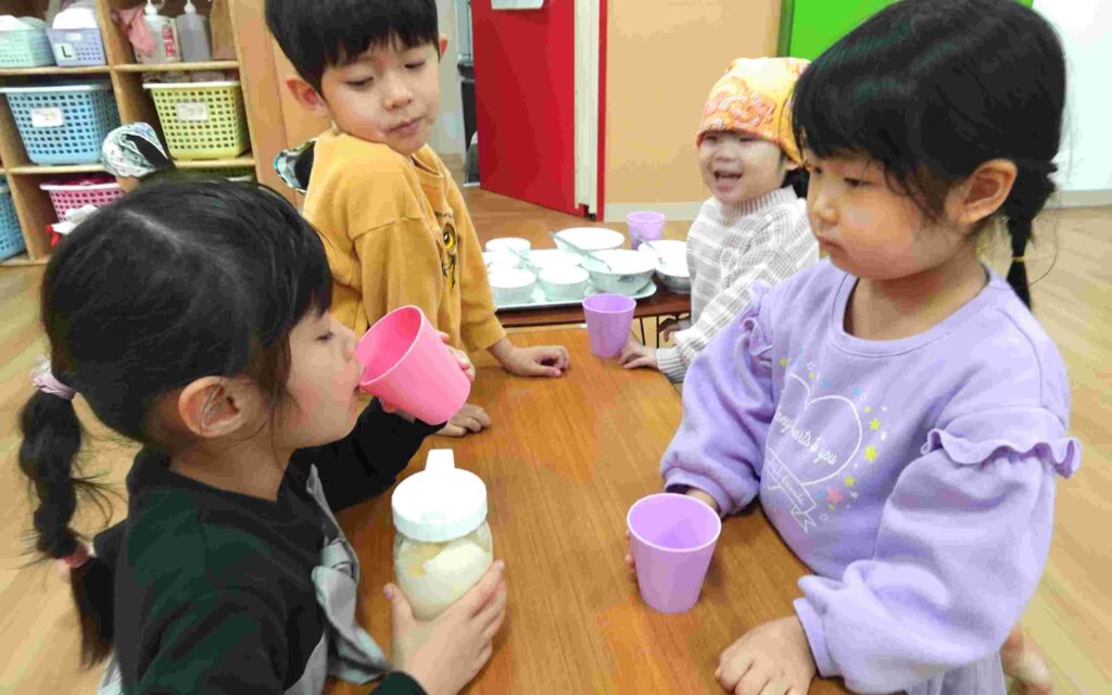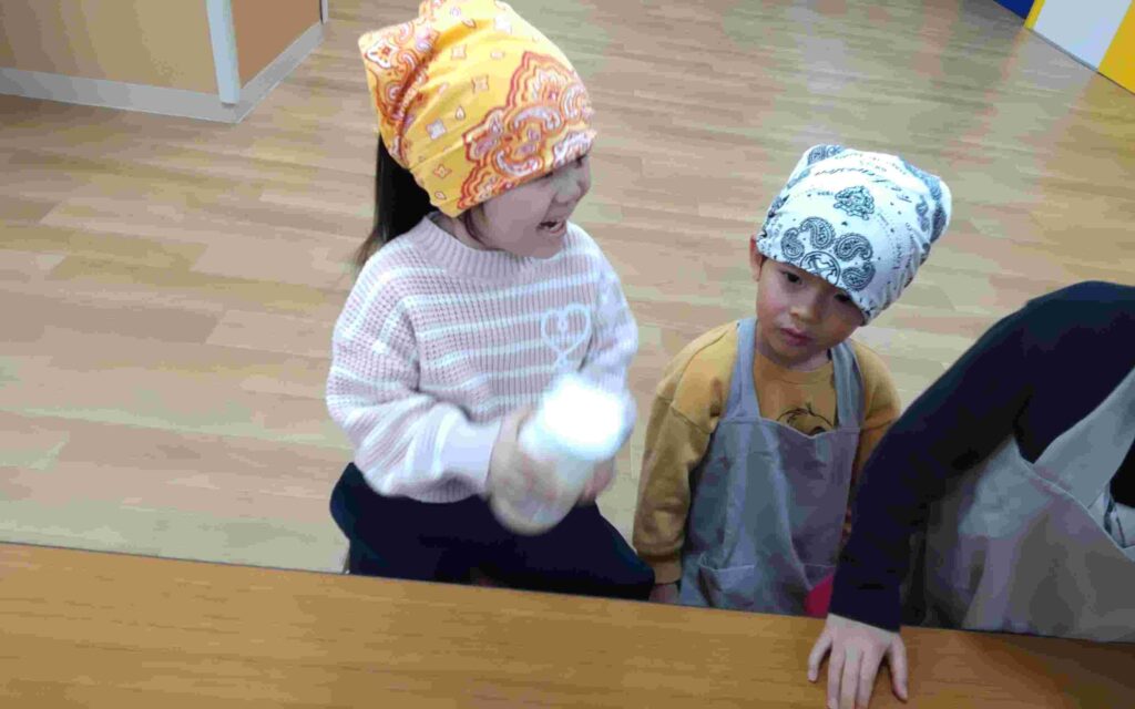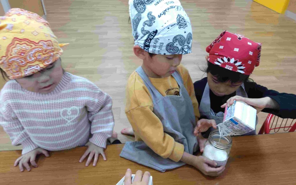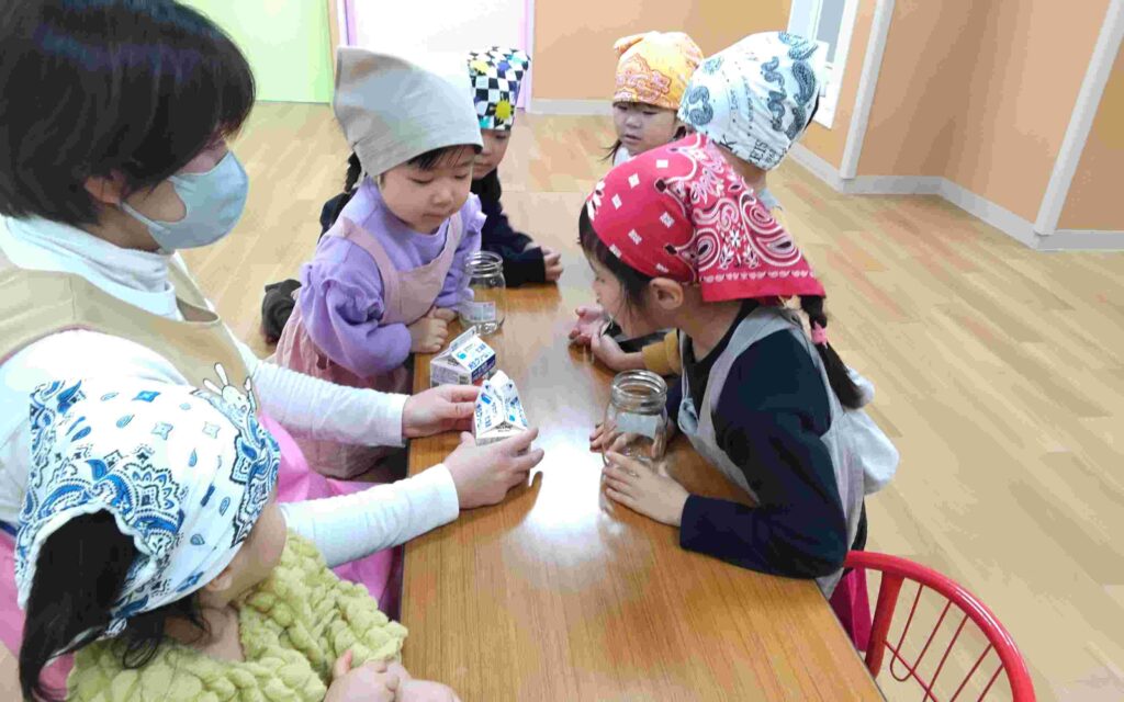 「バターは何からできているでしょう?」の問いかけに「牛乳!!」「チーズ!!」と思い思いに話をしていた子どもたち。「今日は生クリームをフリフリして作るよ」と教えてもらうと、ワクワクの表情を見せてくれました👀