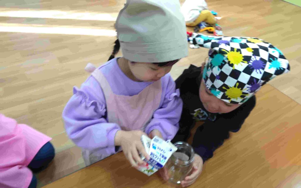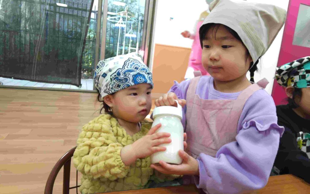 まずは、生クリームをお友達と協力して瓶の中へ入れます。