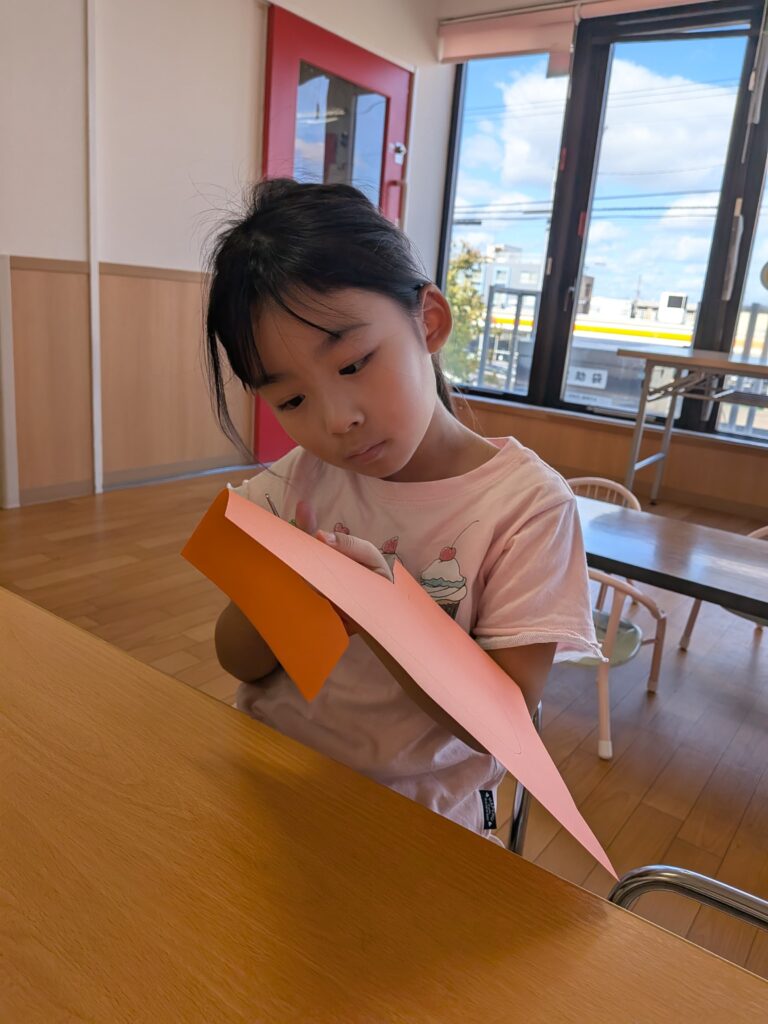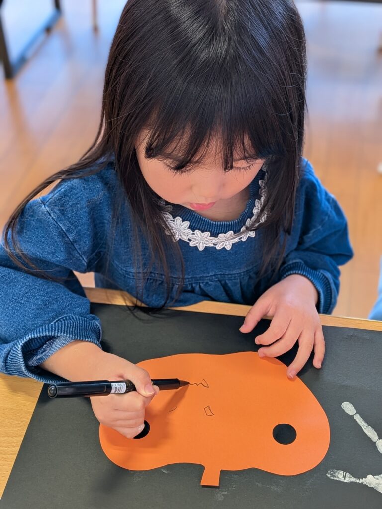 4、5歳児ははさみを使い画用紙をかぼちゃの形にチョキチョキ✂
