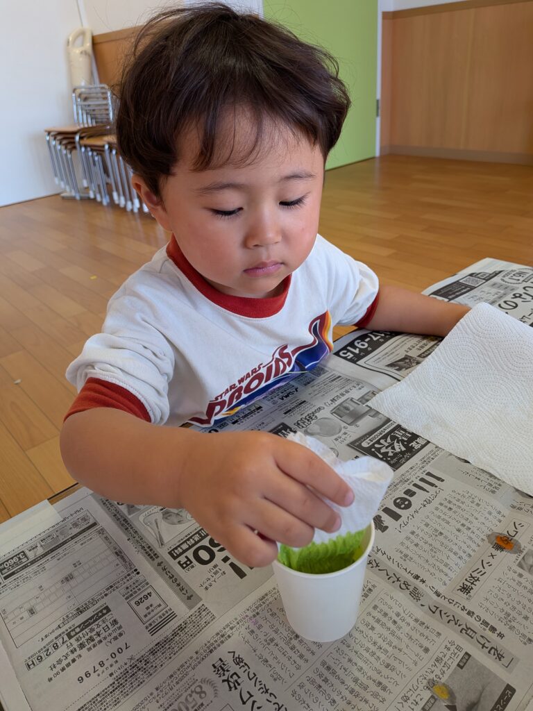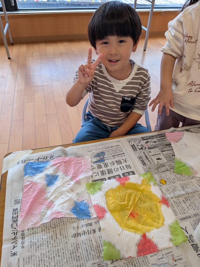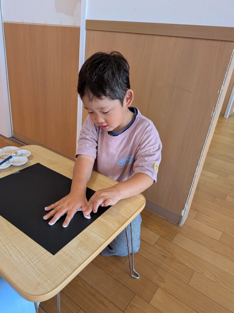 手に絵の具を塗ると、毎回「キャー!!」と叫ぶ子どもたち(笑)