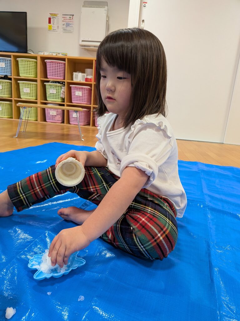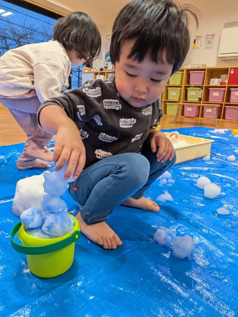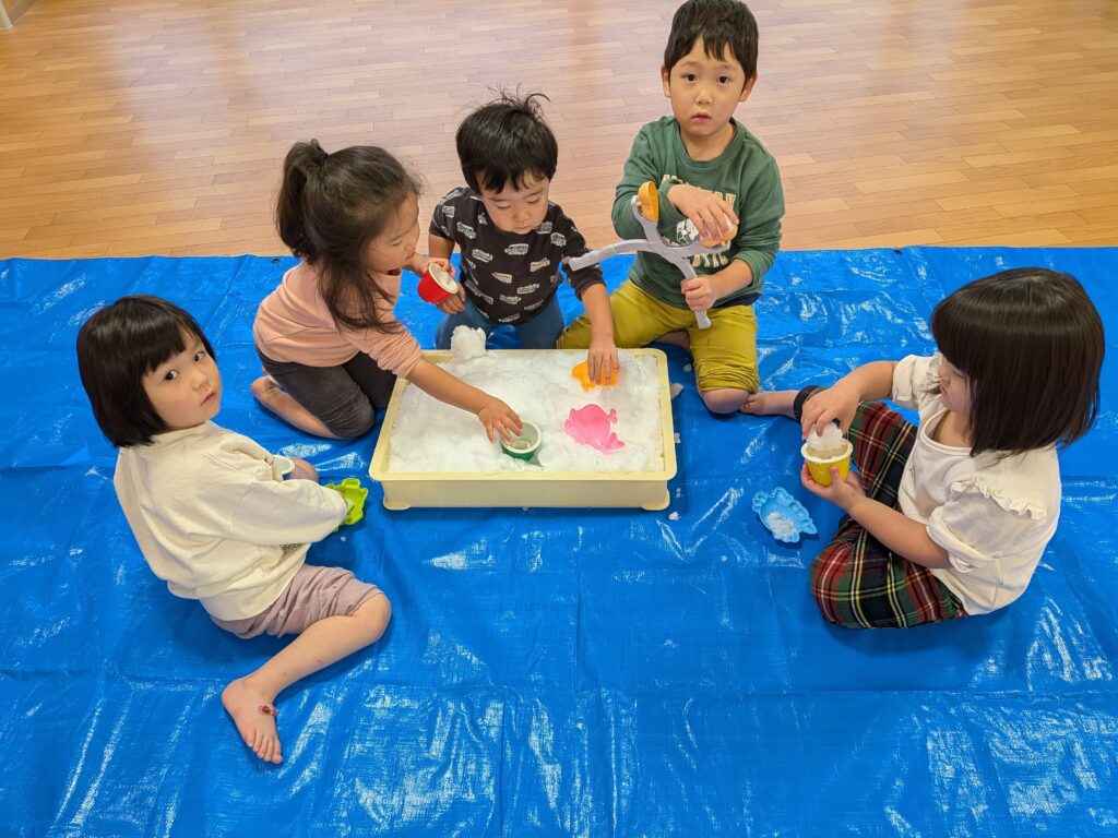「雪遊びするよー!」と保育士が大きなトレーに雪を入れ室内に持ってくると、