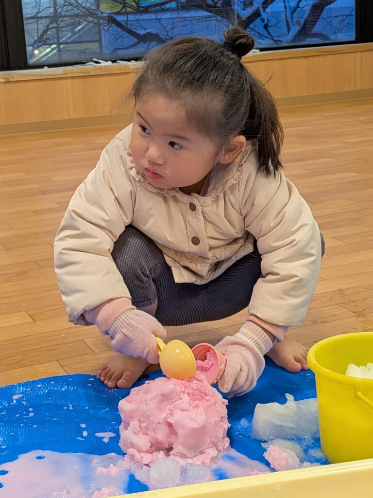 途中、保育士が子どもたちの前にえのぐで色を付けた雪を持ってくると