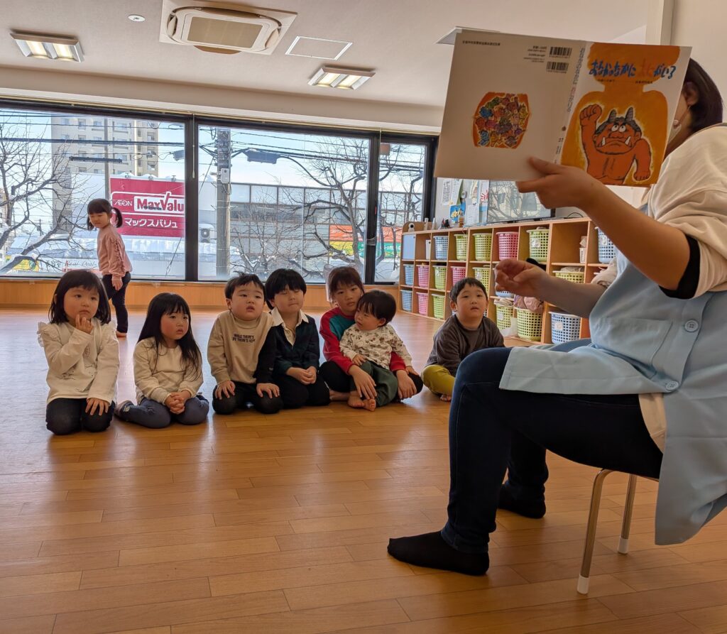 節分の由来説明では、“おなかのなかにおにがいる”という絵本の読み聞かせ。