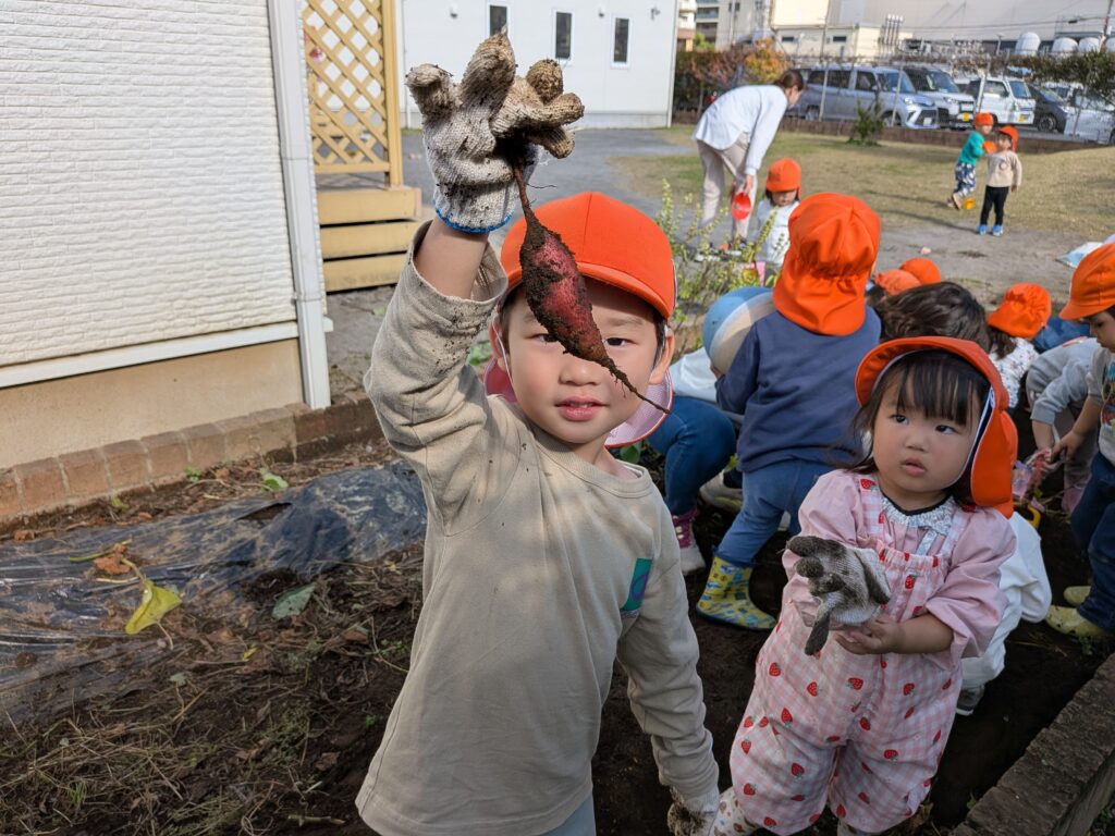 「おも~い!」と言いながら、ずっしりしたお芋をみんなで持ち上げてみます。
