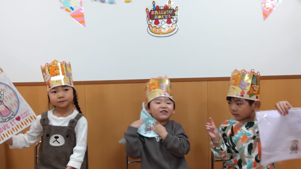 11月のお誕生日会では3人のおともだちをみんなでお祝いしました✨ まずはプレゼントのお渡し!