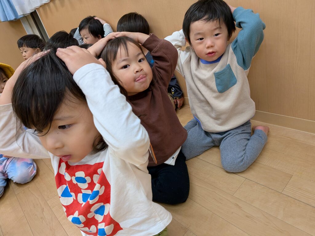 地震の合図にすぐに部屋の真ん中に集まり、小さいお友達もスタッフの話をしっかり聞いて頭をしっかり覆っていました!