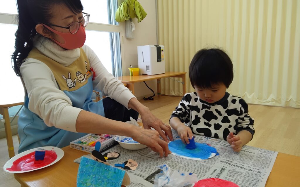 0歳児さんは手形や足型をお雛様たちの身体に🖐🏻👣、1歳児さん~2歳児さんは丸い画用紙にクレヨンでぐるぐる模様を描いてもらい、赤や、青の絵具を『たんぽ』を使ってスタンプとお顔をシール貼りしました!
