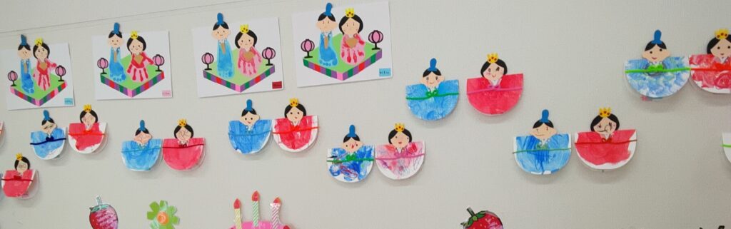 数日前から1階の保育室には園児さんが製作した可愛らしいひな人形の人形が壁に飾られています🎎