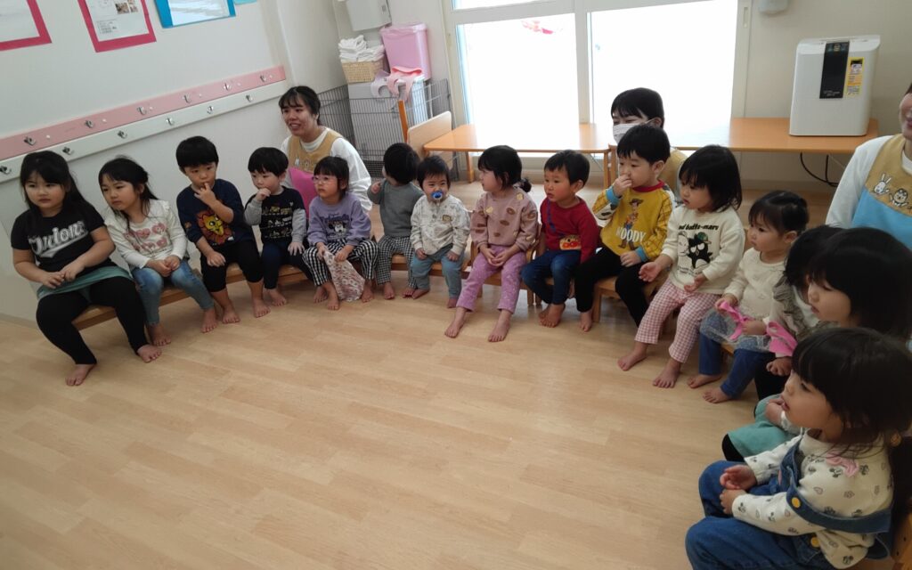 0歳児さんもきちんと椅子に座ることが出来、2歳児さん~4歳児さんは繰り返す歌のフレーズを覚えてくれて一緒に歌うことが出来ていました🎶